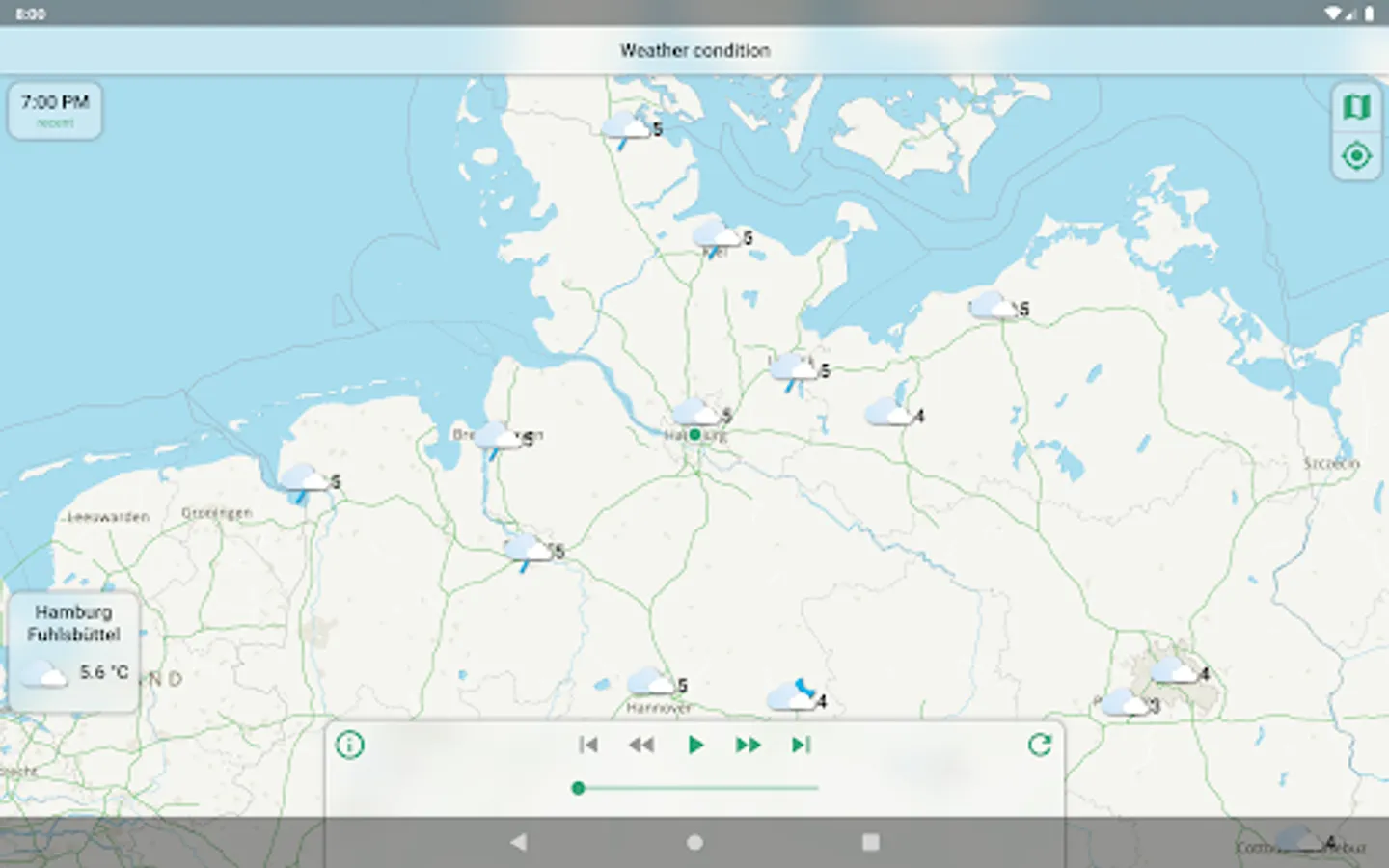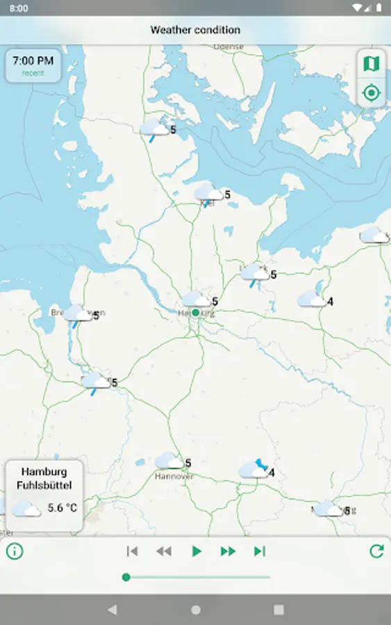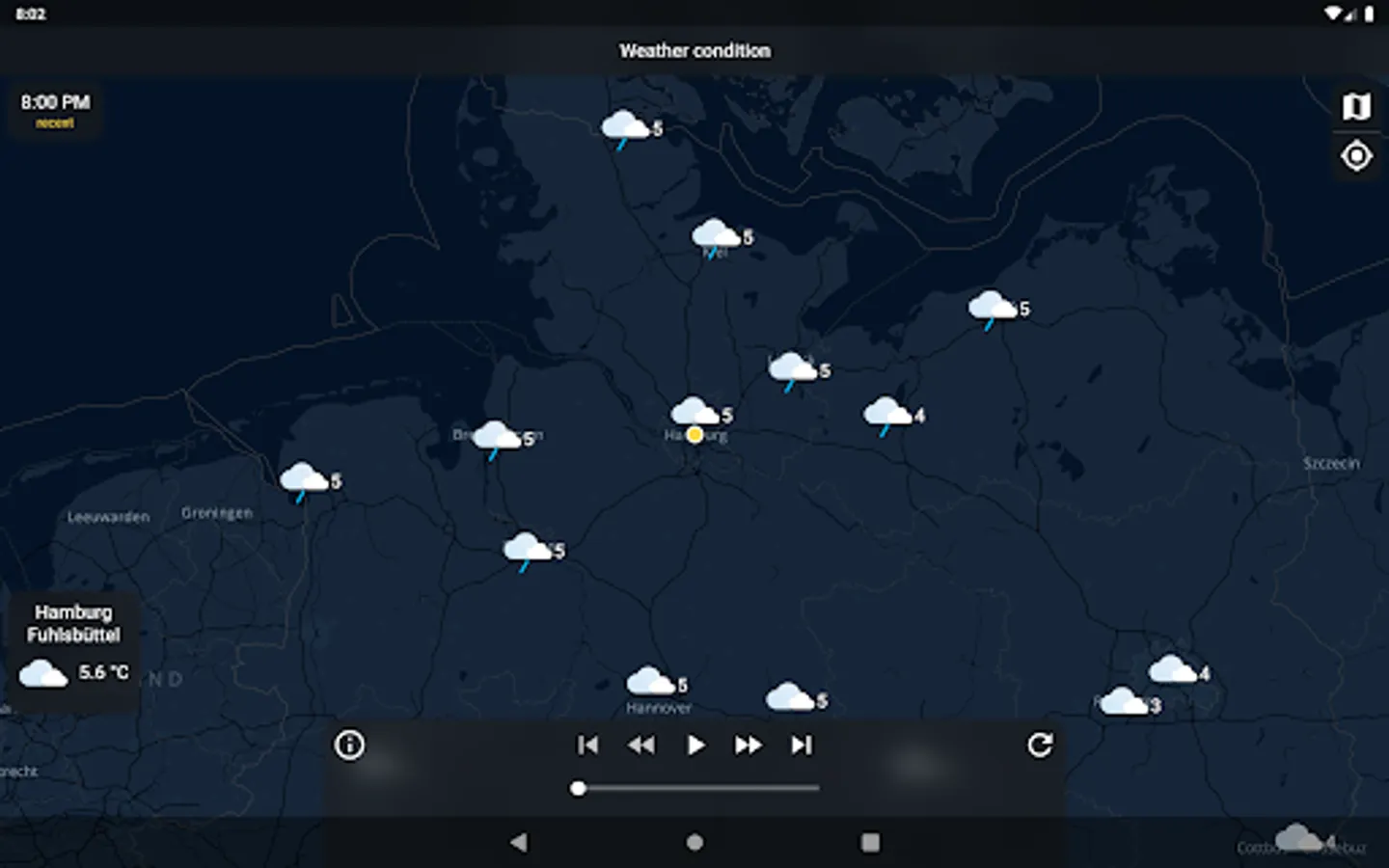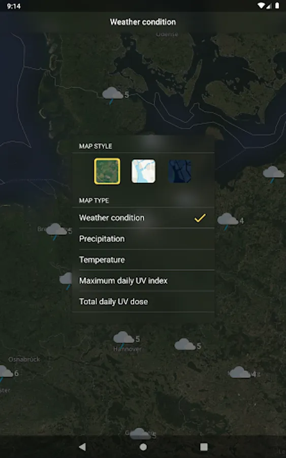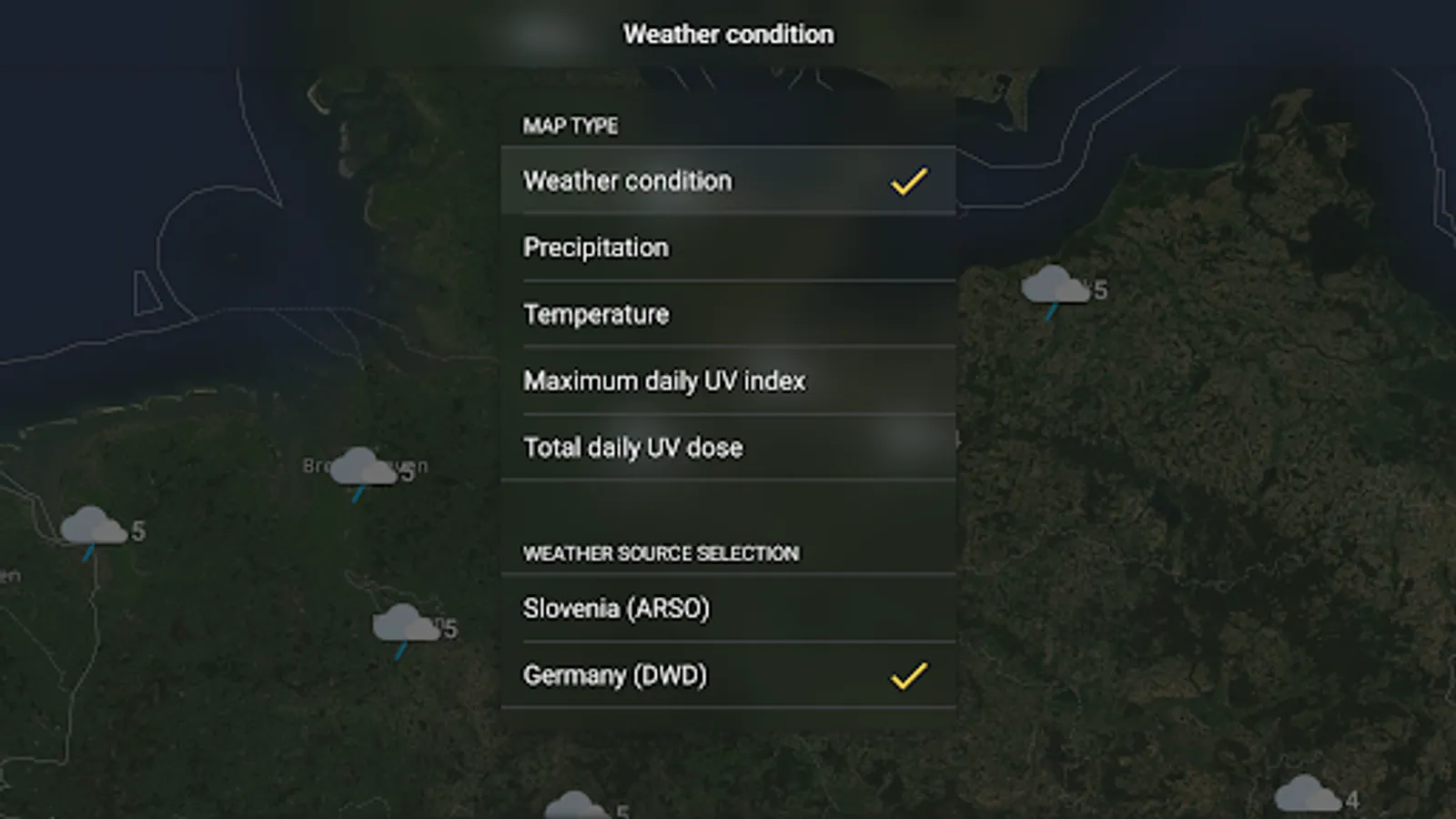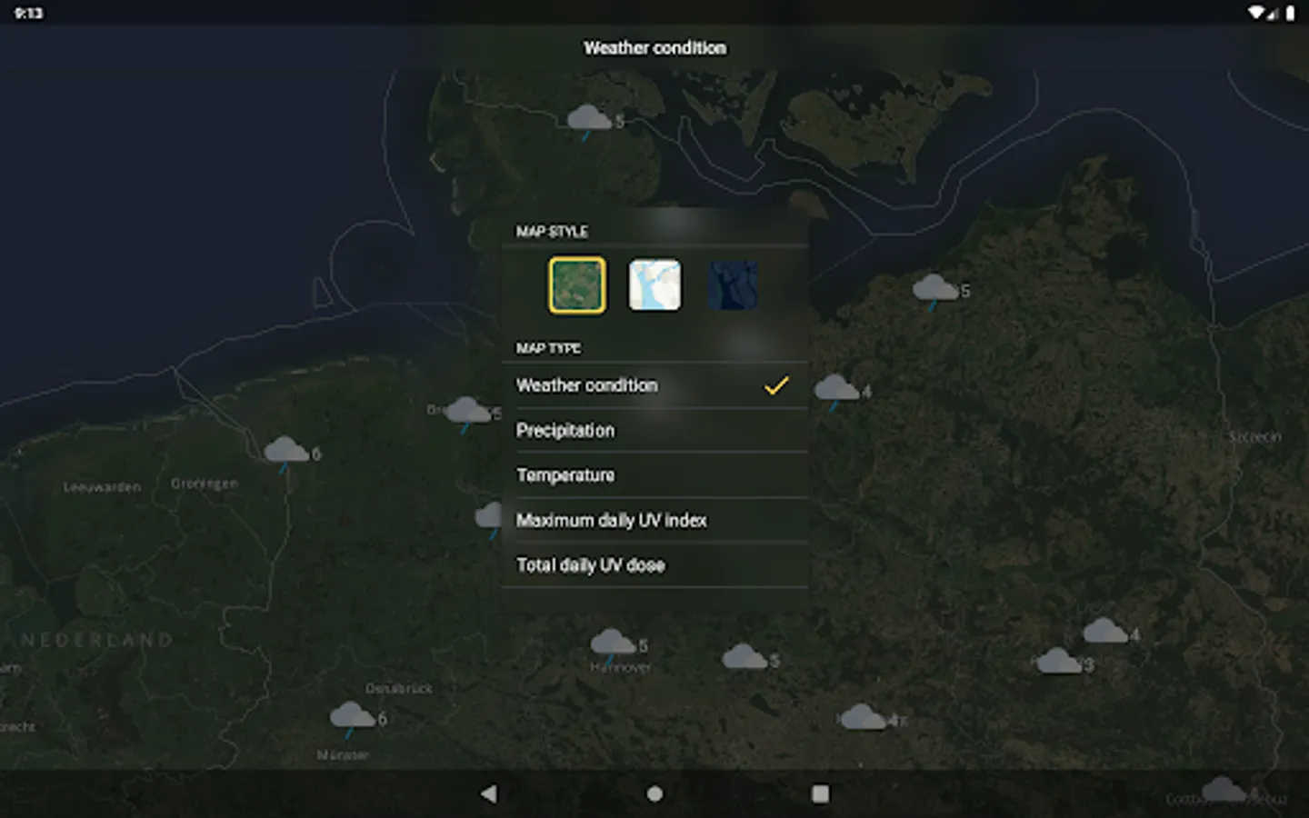 Display weather conditions and forecast on a map in a quick and simple way. Choose between general condition, precipitation radar, cloud cover, wind speed, temperature, UV radiation and hail probability maps (not all supported in all countries). The app also shows the weather at your current location.