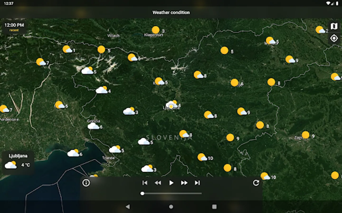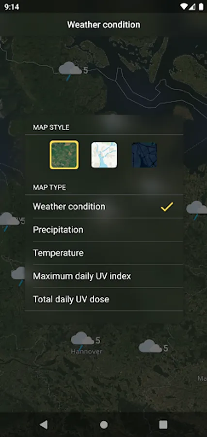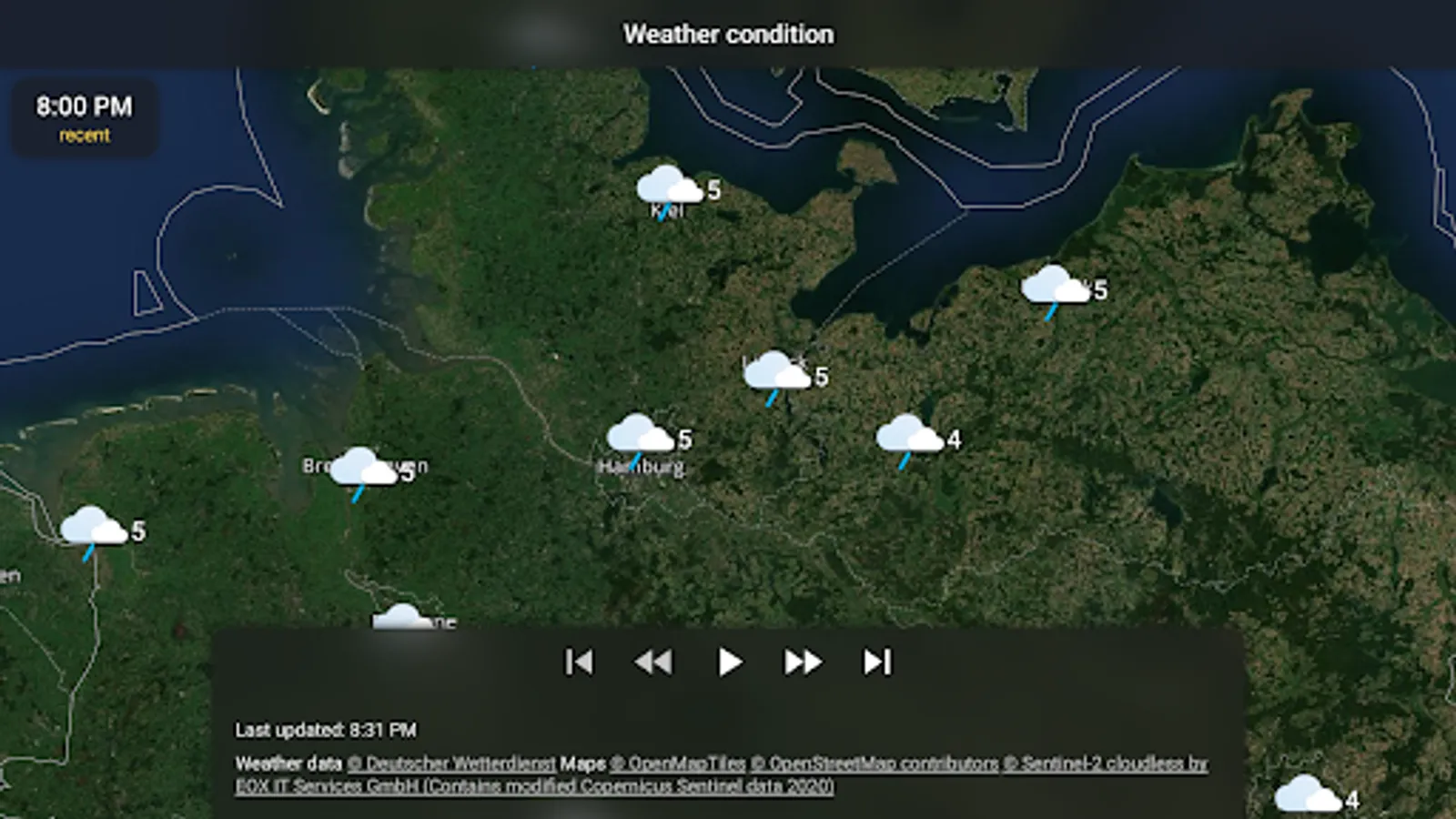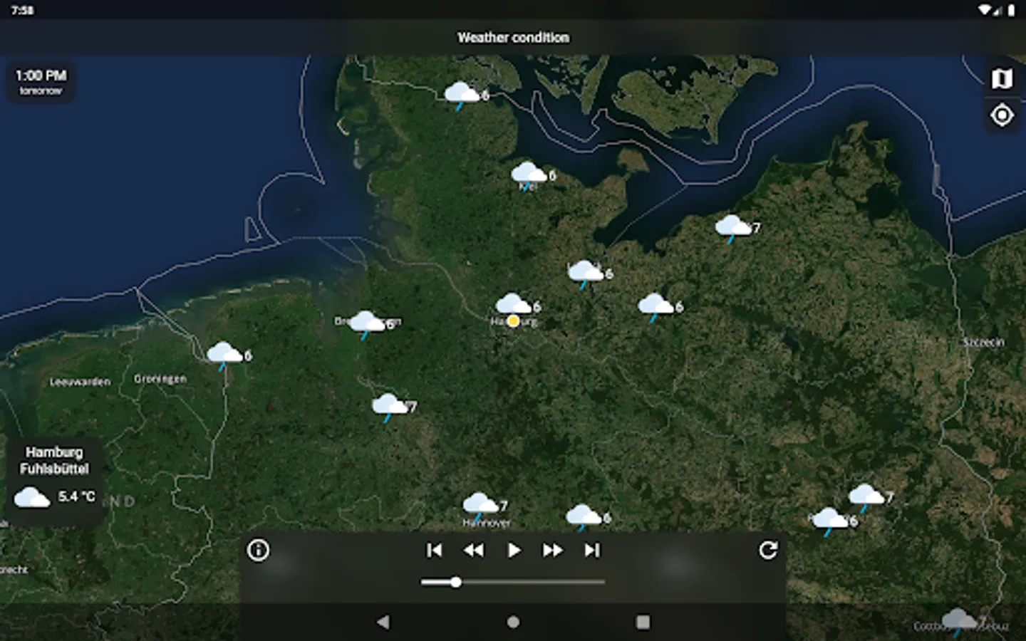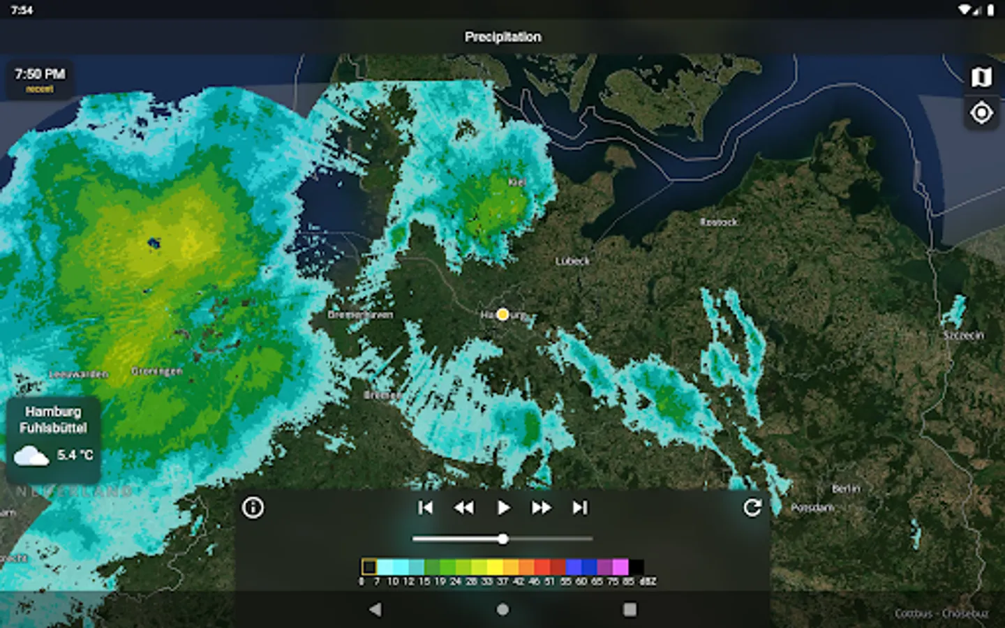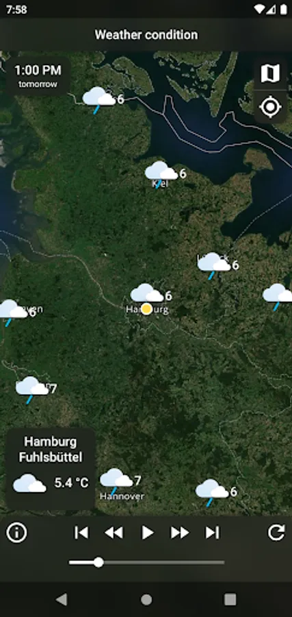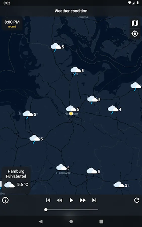 Display weather conditions and forecast on a map in a quick and simple way. Choose between general condition, precipitation radar, cloud cover, wind speed, temperature, UV radiation and hail probability maps (not all supported in all countries). The app also shows the weather at your current location.