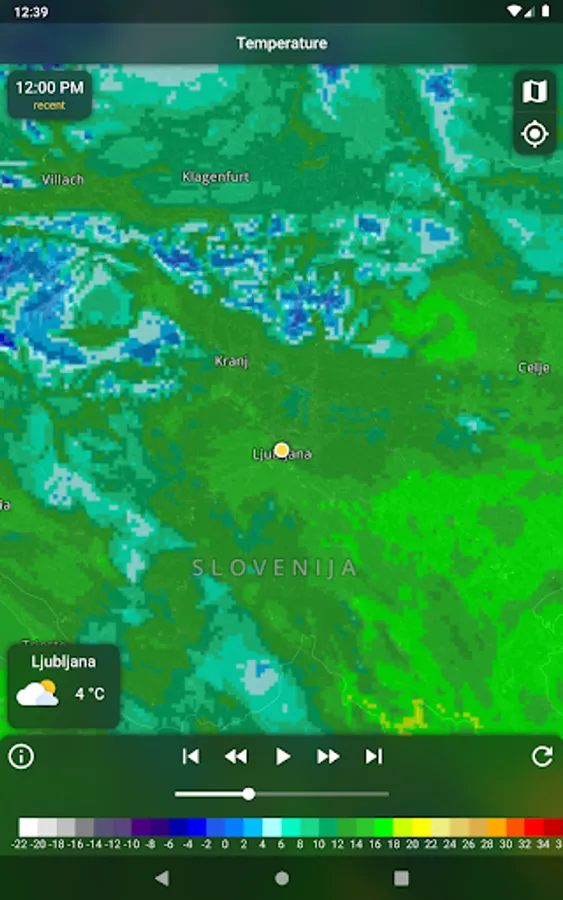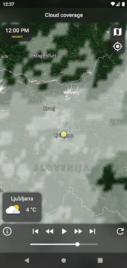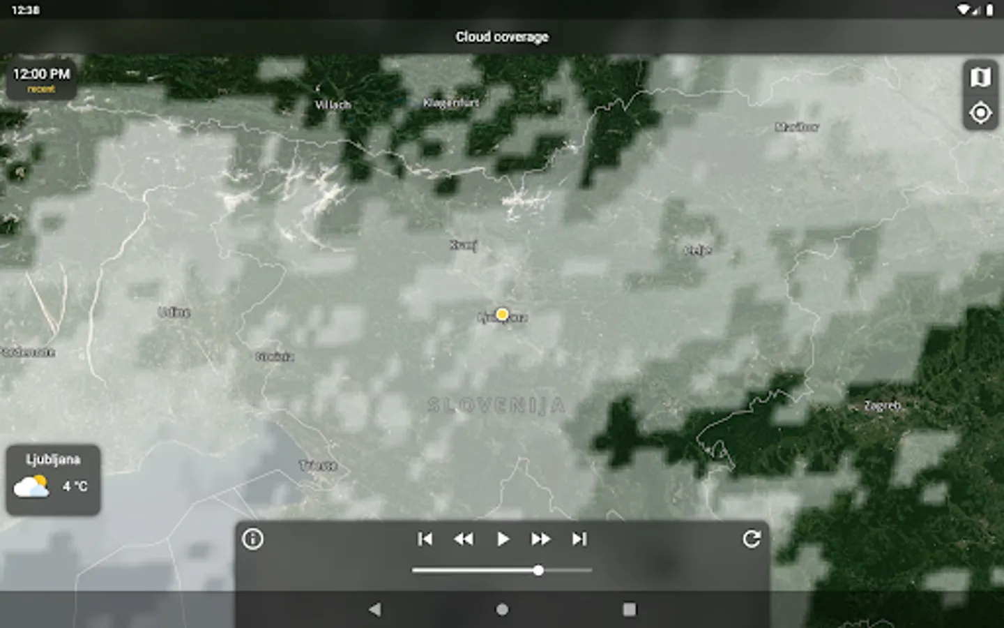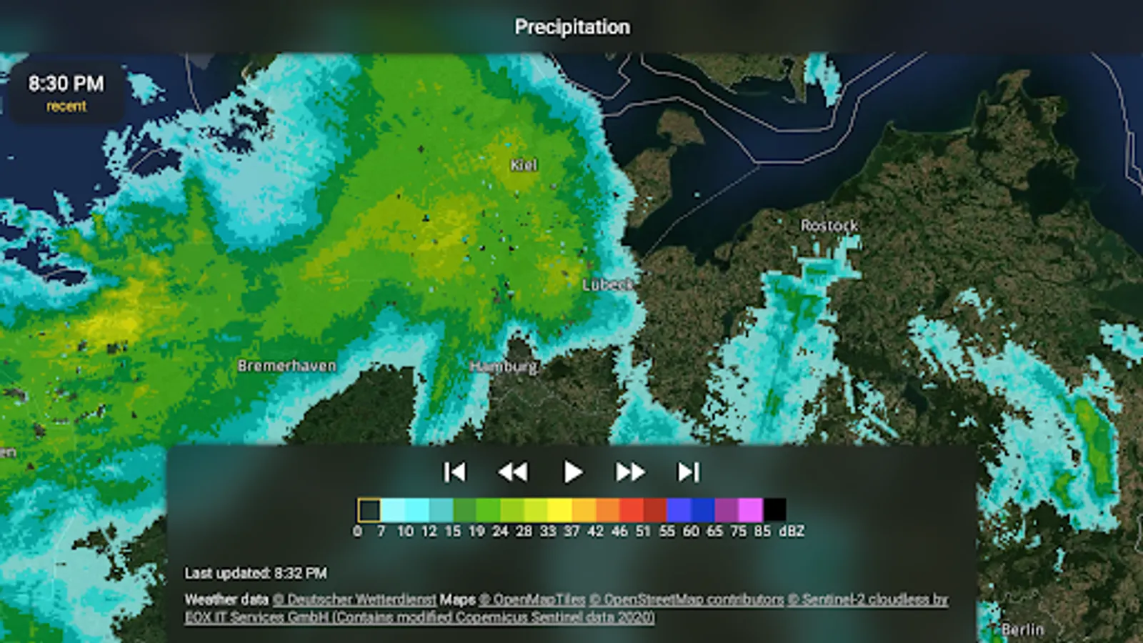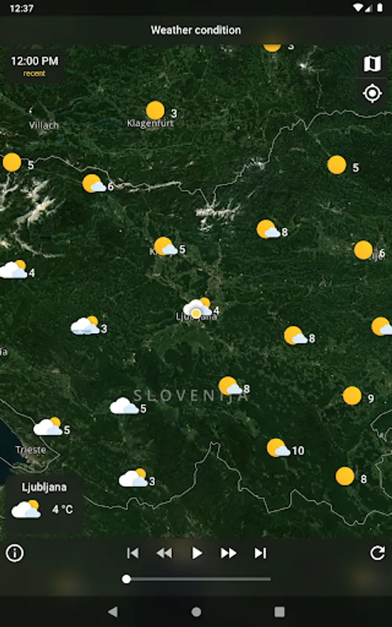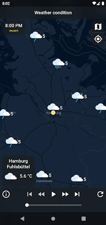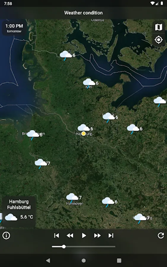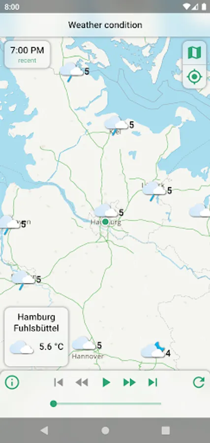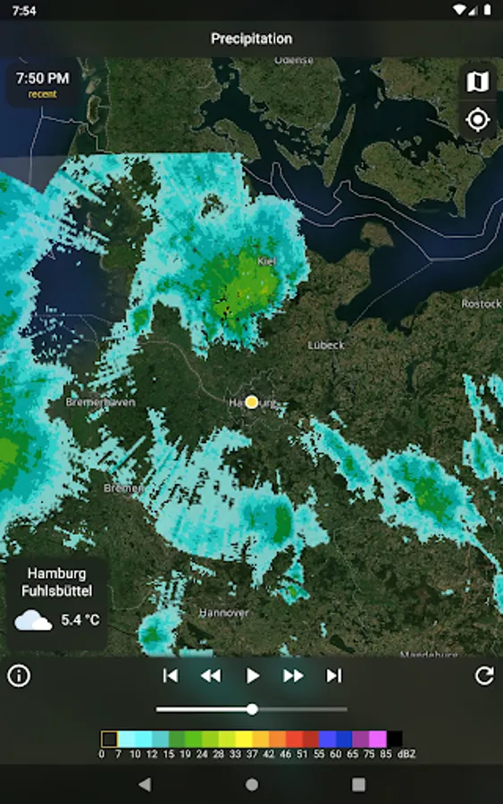 Display weather conditions and forecast on a map in a quick and simple way. Choose between general condition, precipitation radar, cloud cover, wind speed, temperature, UV radiation and hail probability maps (not all supported in all countries). The app also shows the weather at your current location.