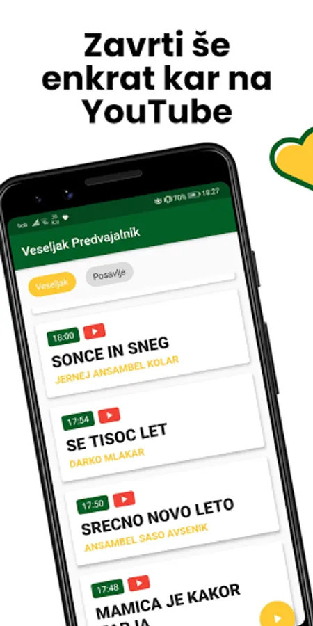 If you are a true fan of Slovenian music, Veseljak Predvajalnik is the right choice for you! Join us now and immerse yourself in the world of Slovenian musical rhythms with just one touch on your smartphone. Don't miss a single note - download the Veseljak Predvajalnik application today and enjoy the best Slovenian music anywhere and anytime!