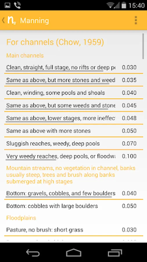 App also contains short theory behind Manning equation and table with values of all Manning coefficients. Manning equation is empirical equation estimating open channel flow: