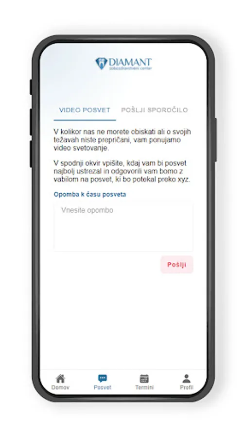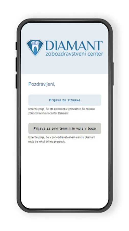 The Diamant mobile application is intended for all customers of the company registered in the system and for new potential customers who can book their first check-up via the mobile application. The mobile application enables the review of free appointments, communication with a doctor, submitting a request for a video call, reviewing past appointments and invoices, reminders to brush your teeth, order appointments and review posts.