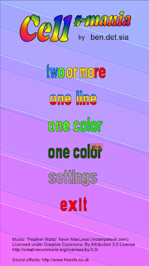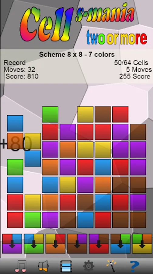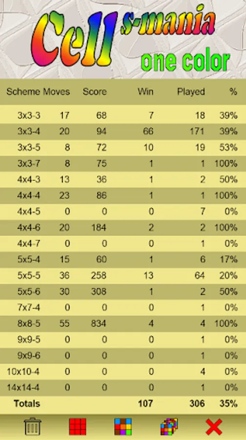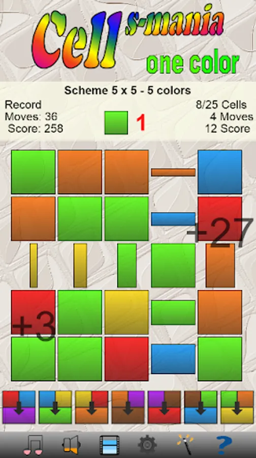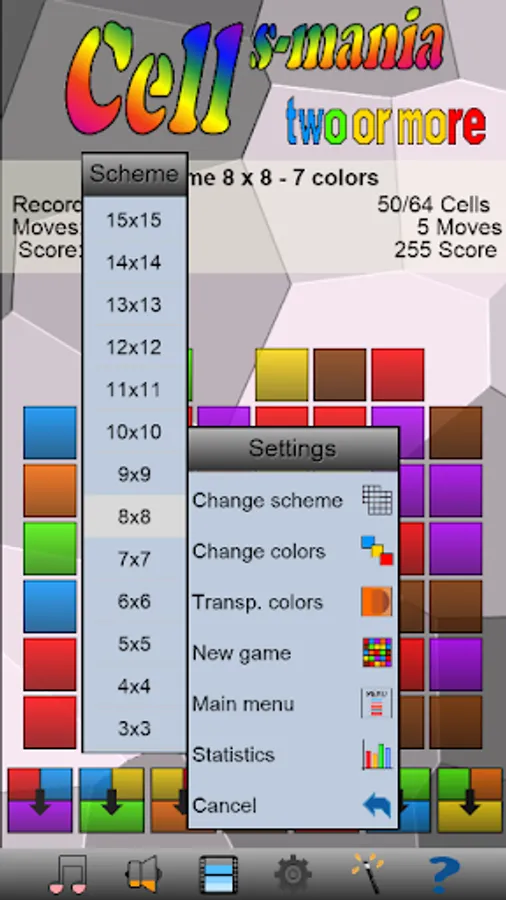 You can select the scheme from 3x3 to 15x15 cells and from 3 to 7 colors. You can combine two adjacent and different color cells to create a new complementary color cell.