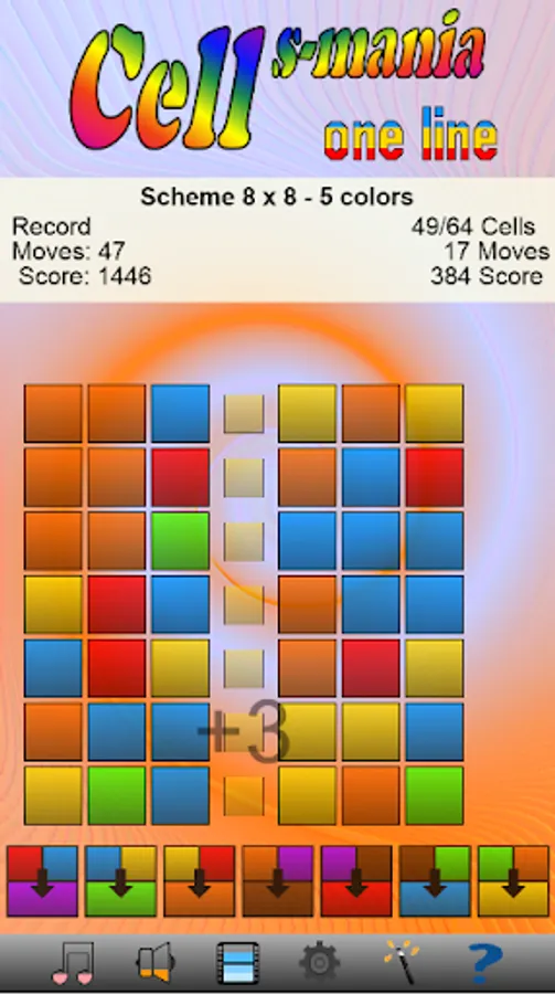 Select two or more cells of the same color, vertically and/or horizontally, to remove them and obtain scores.