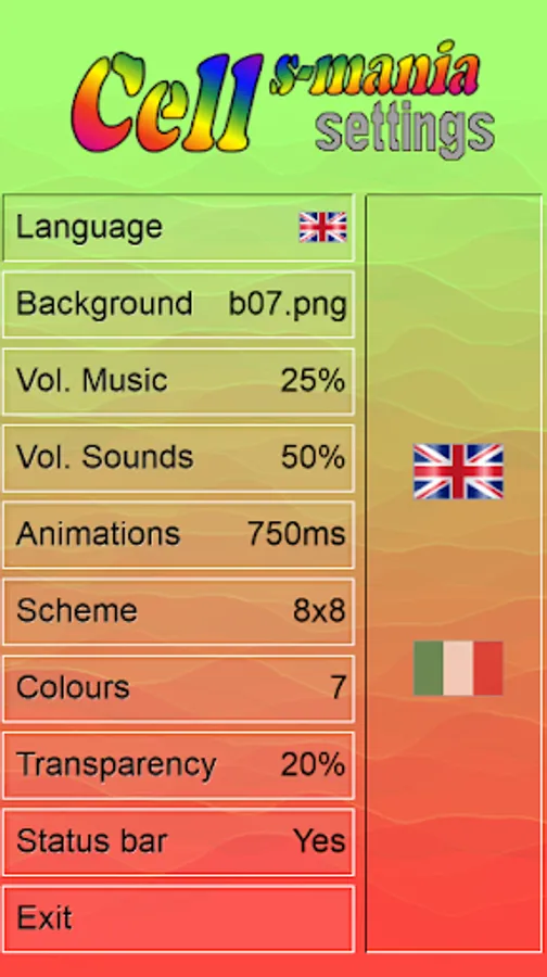 You can manage the volume of the background music and/or sound effects, the time of the animations, the game statistics and get hints or help from the icon bar.
