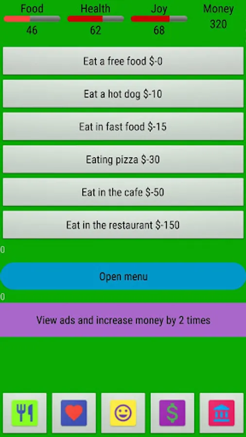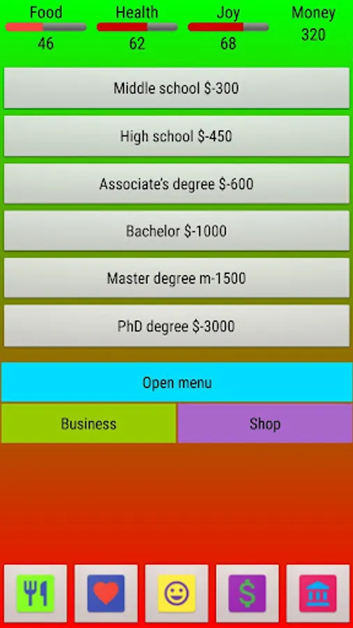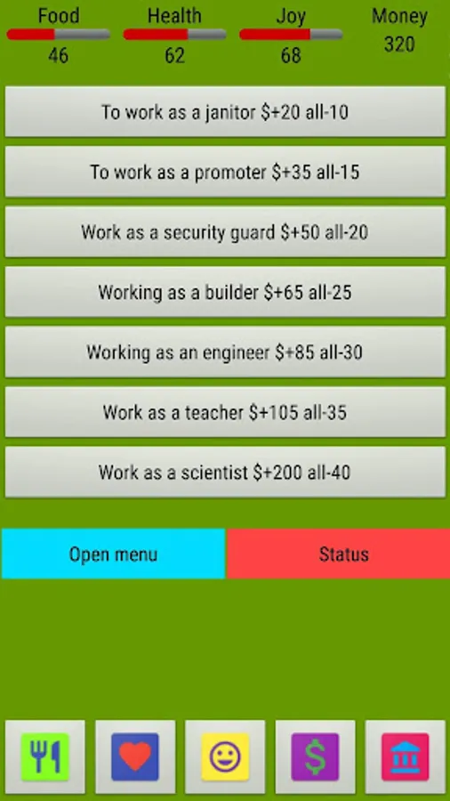 Get an education and a new job! Improve your living conditions from the box to the Palace! Do not forget to carefully monitor vital signs!