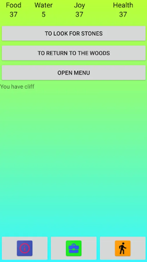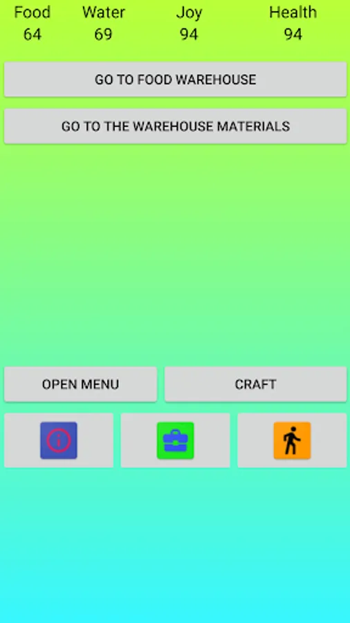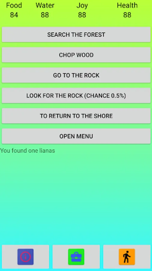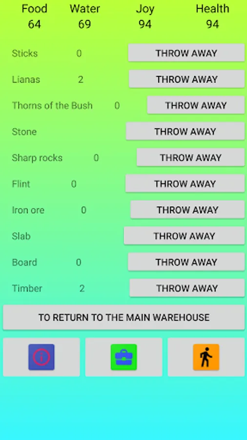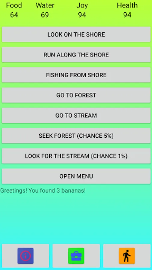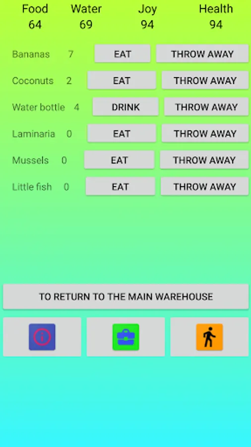 To survive on the island, You need to monitor the level of satiety, health, mood and thirst. To replenish health and mood, go Jogging on the shore - they are useful.