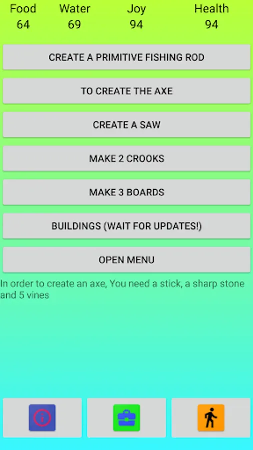 The game is available crafting items: fishing rod, ax, saw, Croaker, boards.