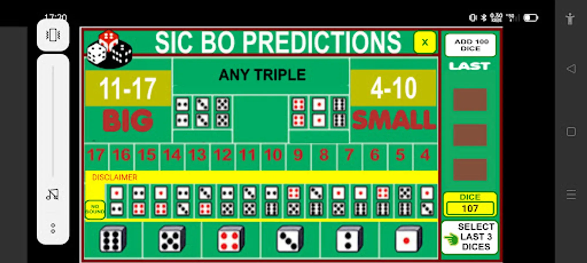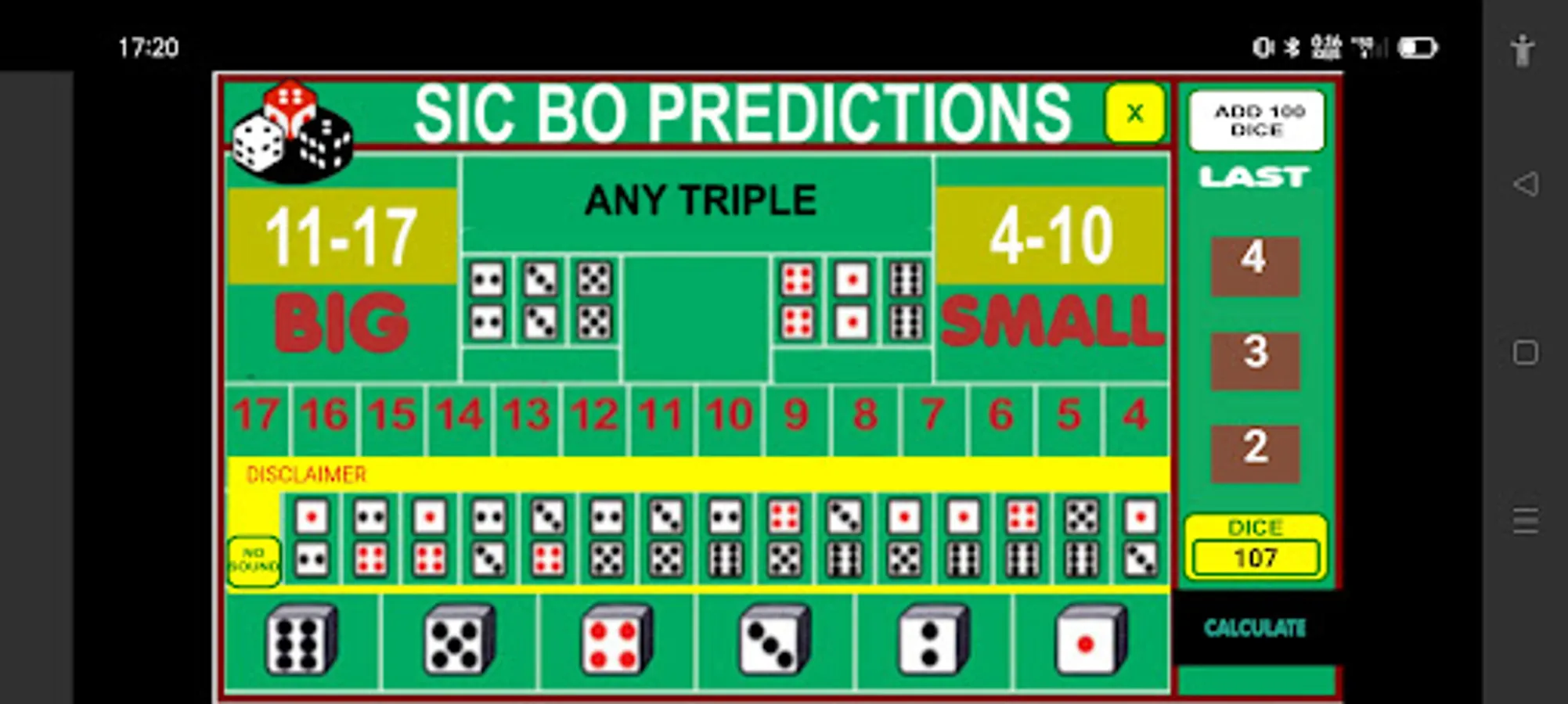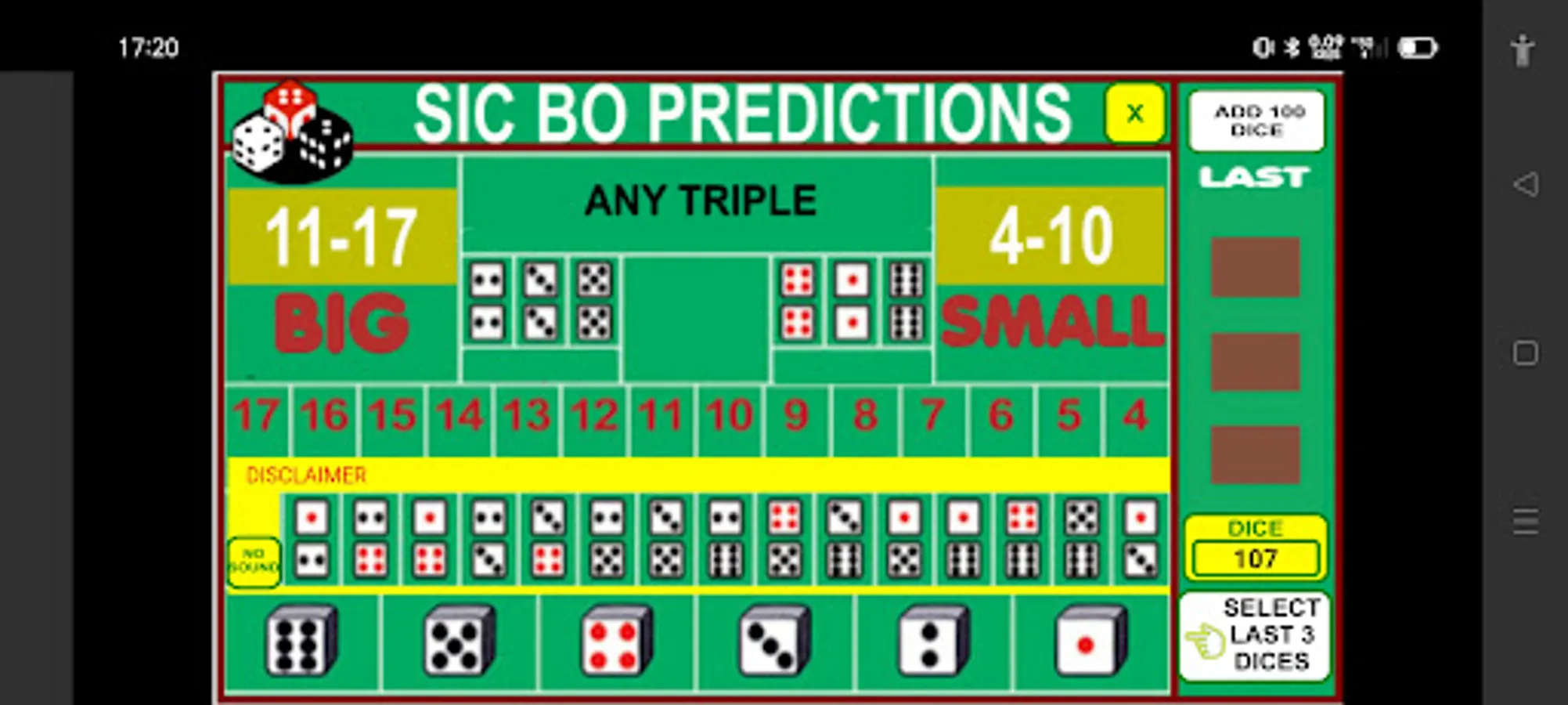 The app will try to calculate the next dice telling you Big or Small , whether to play any triples, pairs, single dice and sums. Have fun with our sicbo app.
