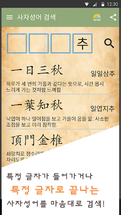 특정 단어가 들어가는 사자성어를 마음껏 검색할 수 있습니다.