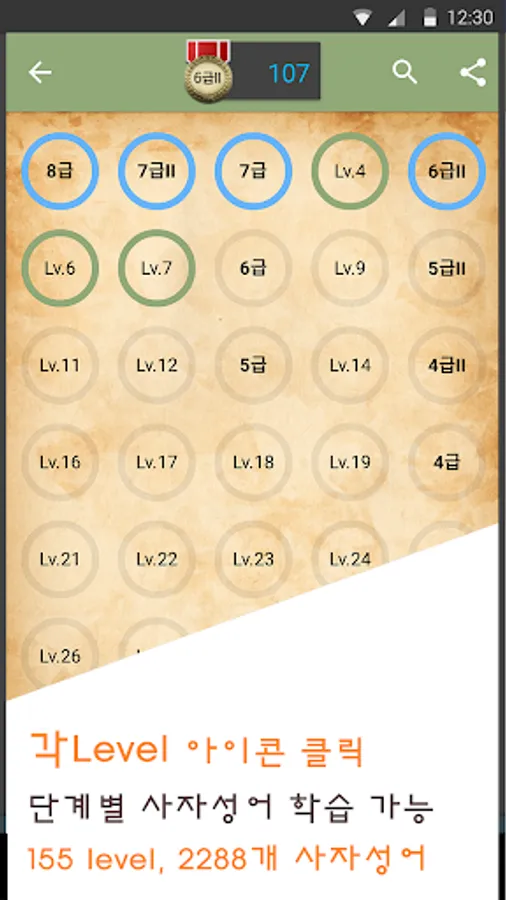 한자능력 급수 Level을 통과하면 파란 원으로 표시됩니다.