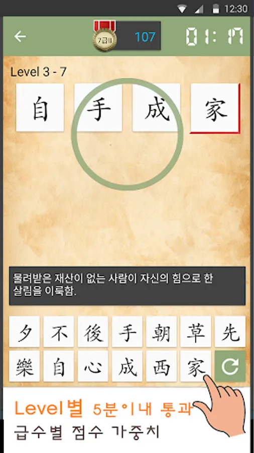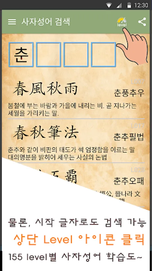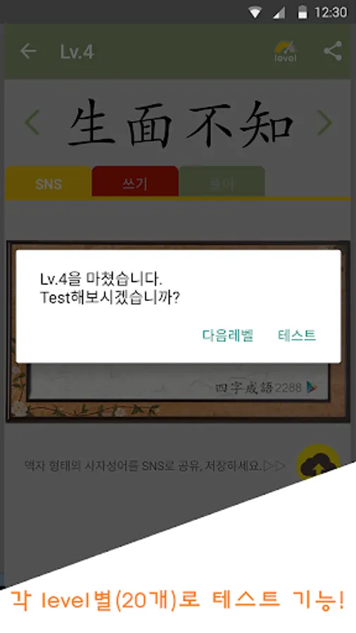 레벨별 사자성어는 20개에 불과하니, 하루에 한 단계씩 학습해보세요.