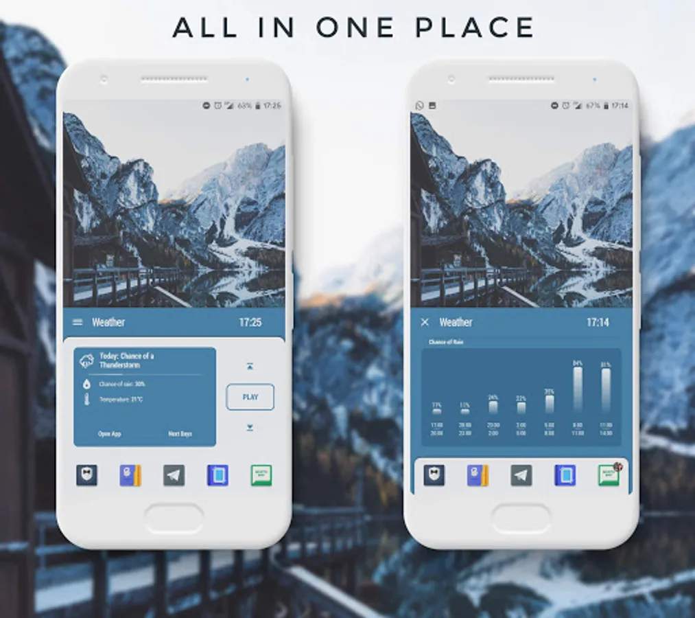 The weather screen will show the general forecast (through the icon) and the chance of raining of the next 12 hours (through the process bar and percentage) of the two chosen cities.