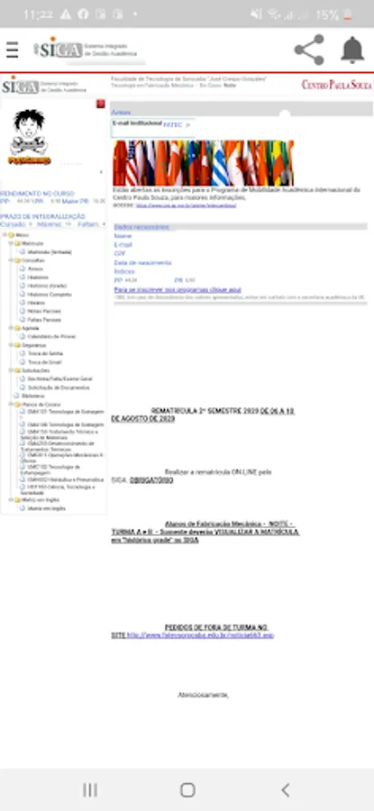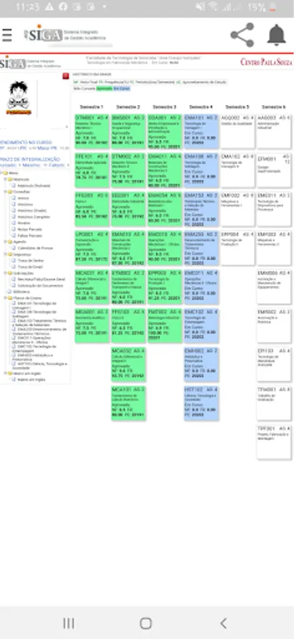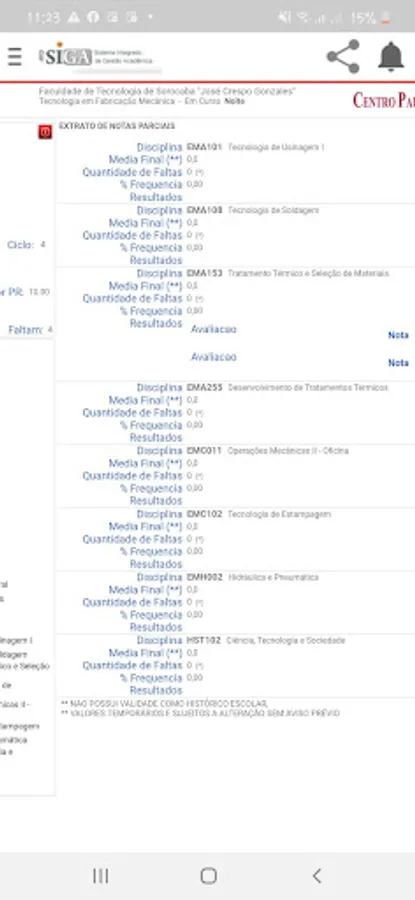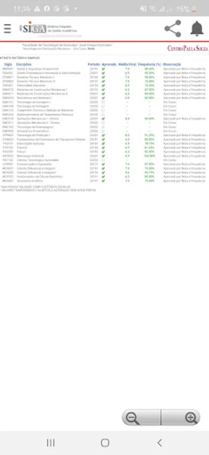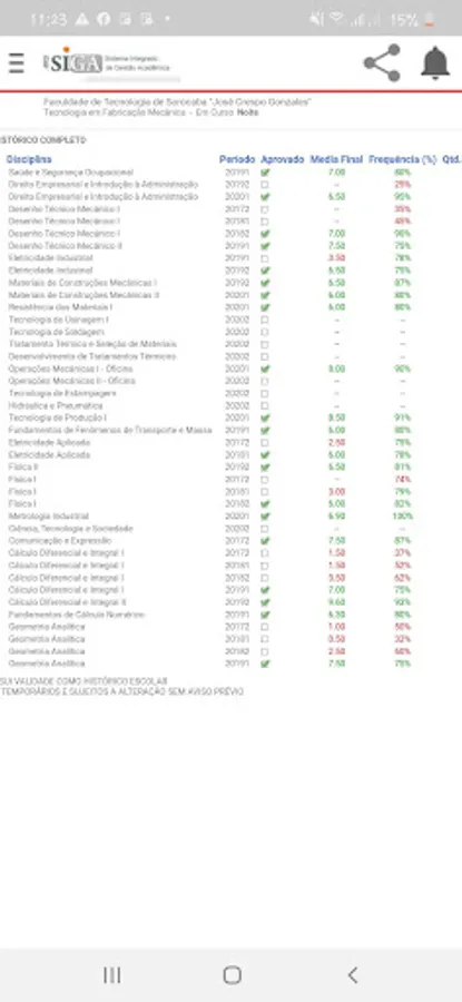 In the phase of implementation and improvement, the Integrated Academic Management System (SIGA) is the official source of all data referring to the courses taught, including students' academic records, under the terms of the General Graduation Regulations.