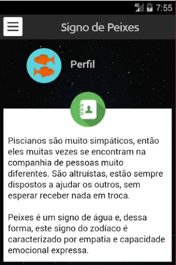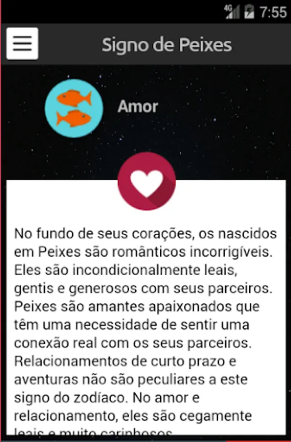 Learn all about the zodiac sign, the app brings a lot of information for you know very well people fish. It includes information such as: