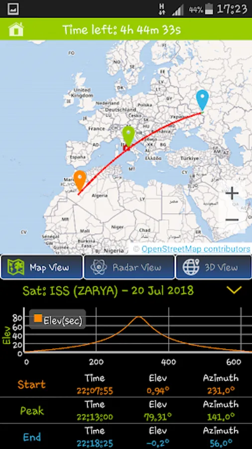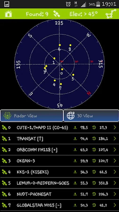 - Satellite predictions passes with step up to 24, 48, 72 hours with Map View and Compass View details.