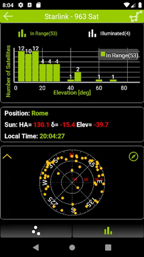 - Display of What's up in your sky over your head with Map View and Compass View details