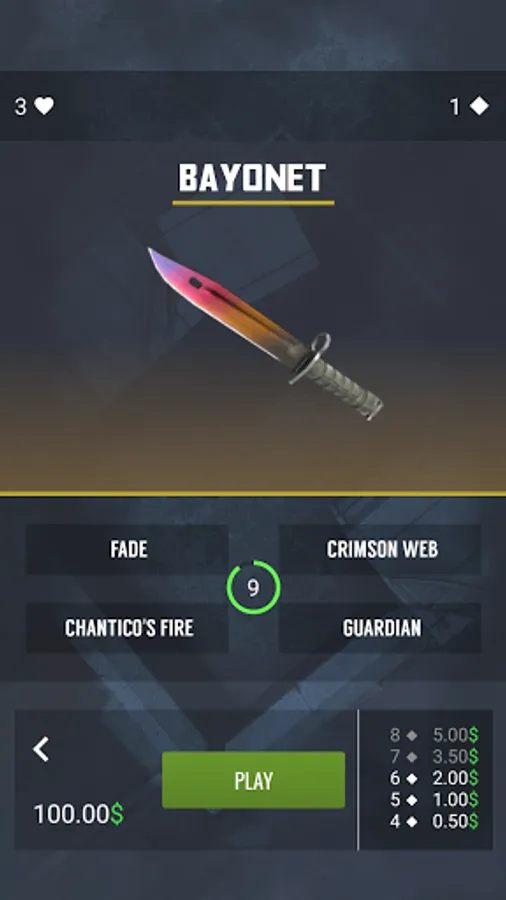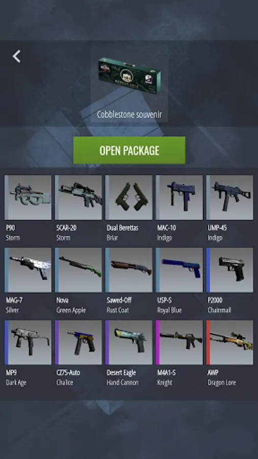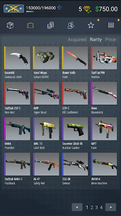 • Inventory - all your weapon and knife skins in one place. Review and sell your skins you do not want in your inventory by tapping on them.