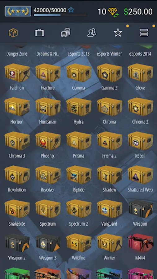 • Cases - here you can choose the case or souvenir you would like to open. Simply tap the crate you wish to open. Opening cases is completly free! If you feel rich, you can even choose to open a premium custom case!