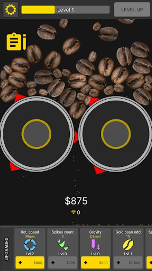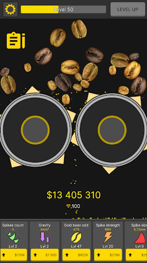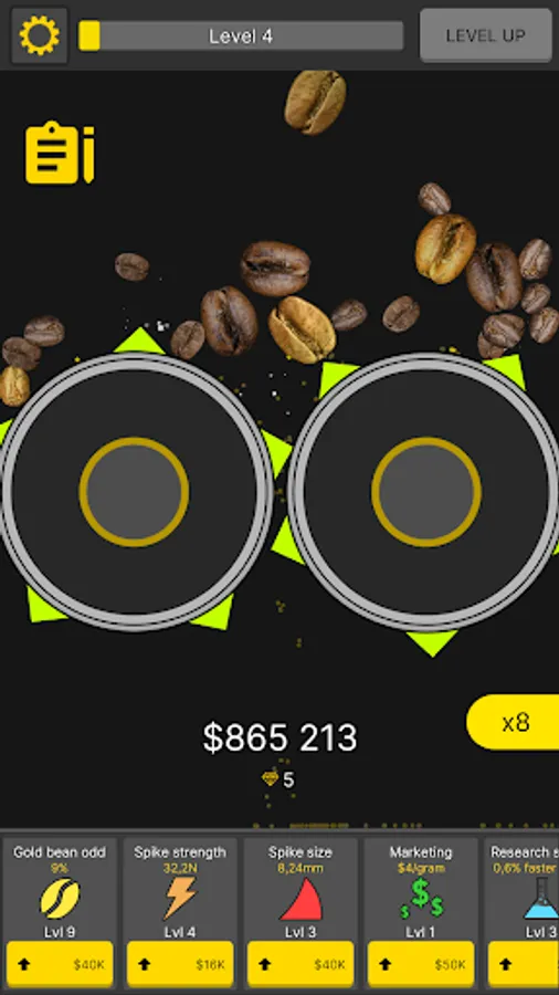 Crush coffee beans and earn money to upgrade your machine, teeth, bean properties and more! Start from a small coffee factory to a fast factory with golden beans.