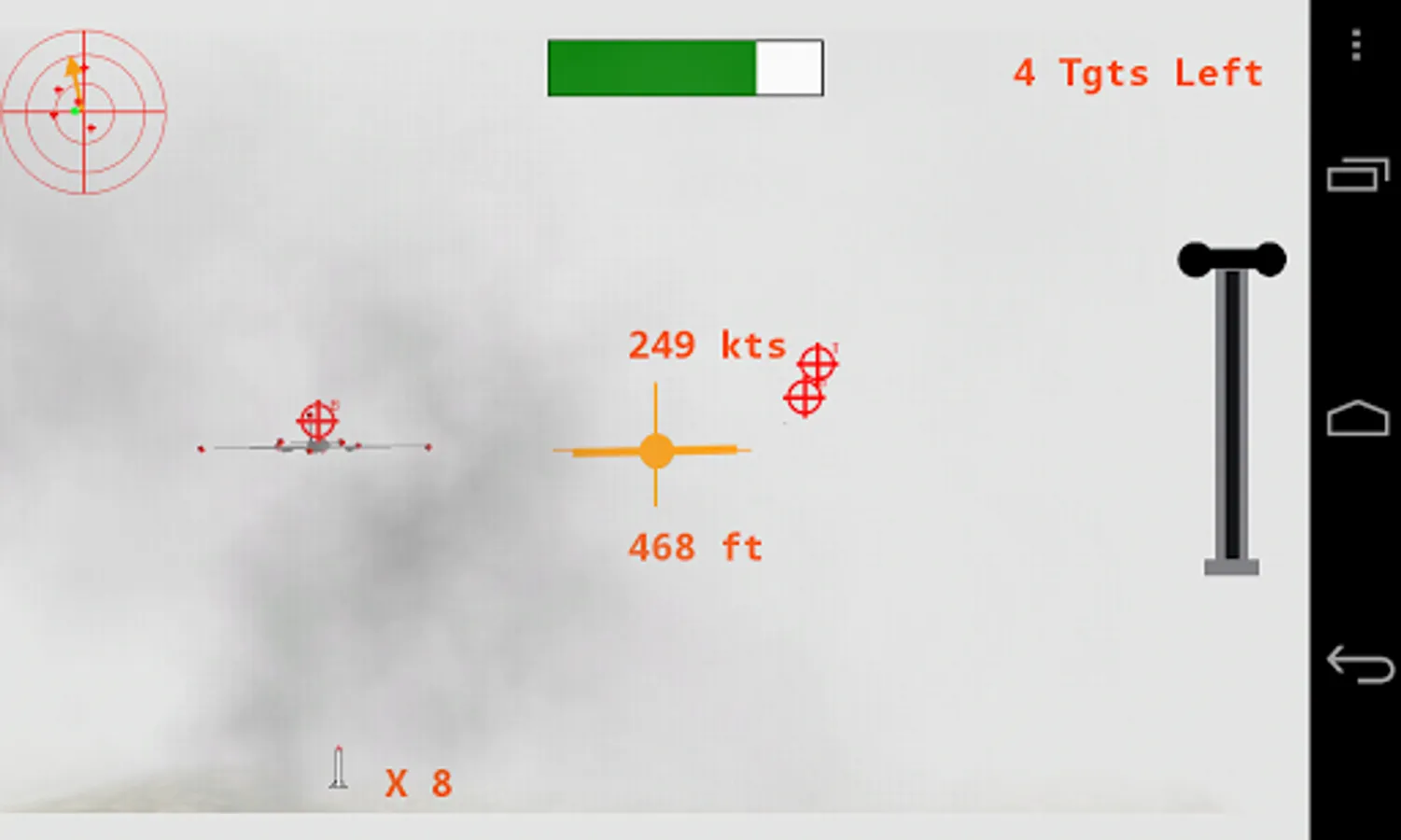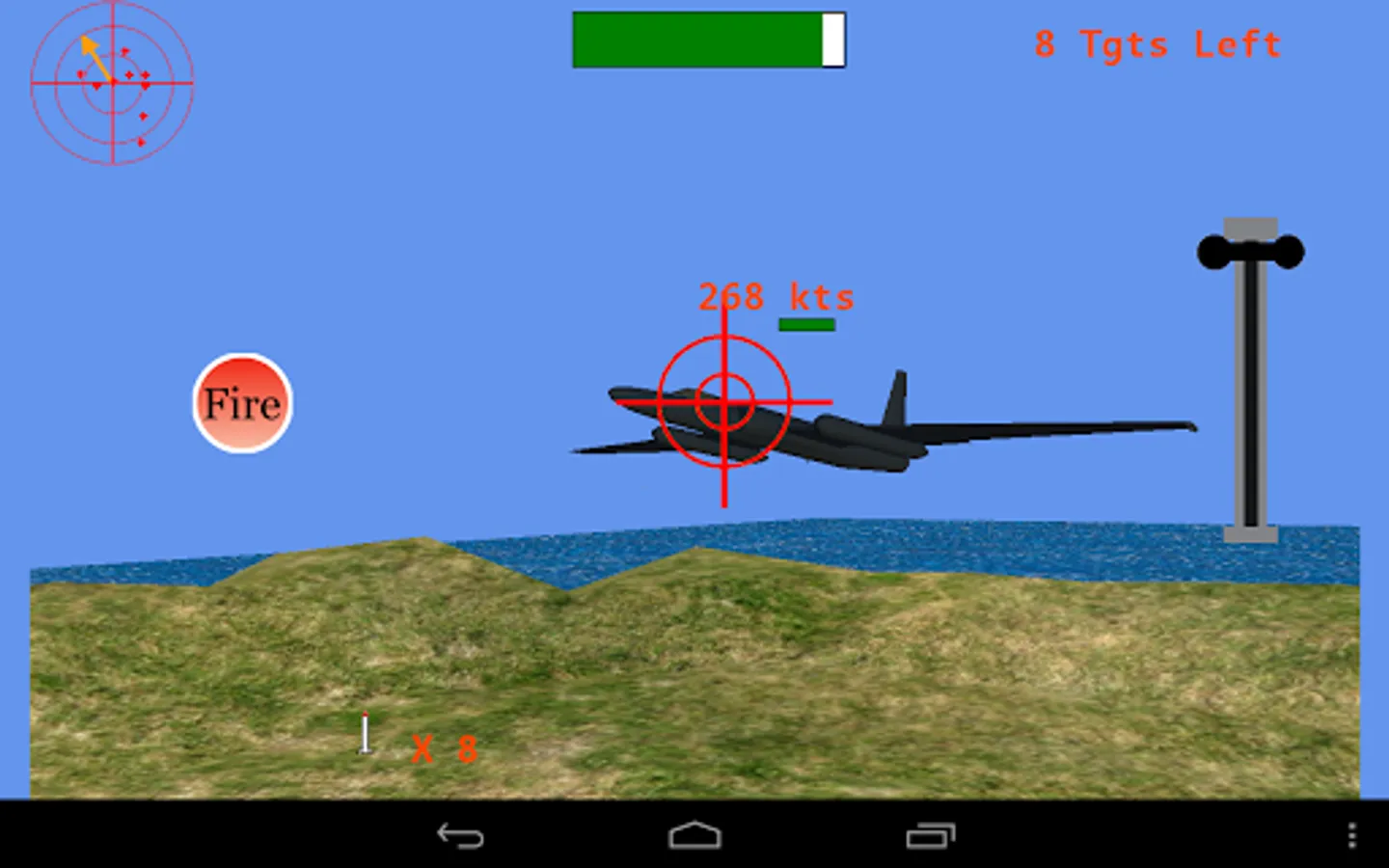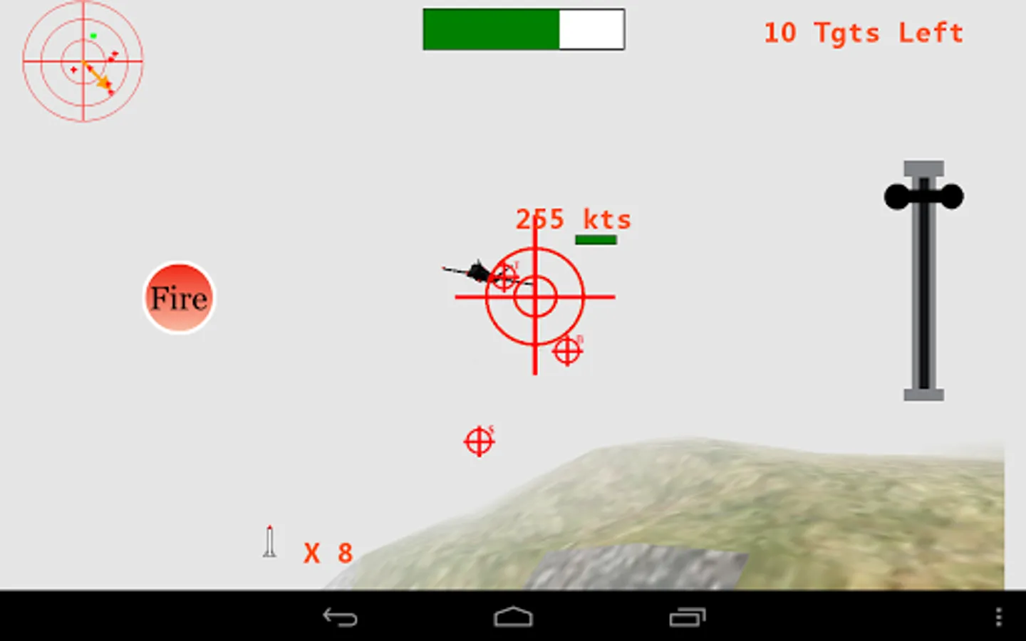 Outmanoeuvre other Fighter Aircraft and Land safely to replenish Rockets to complete your Mission. Radar and HUD Tracker Options available to make your Mission easier. And a High Games Scores count.
