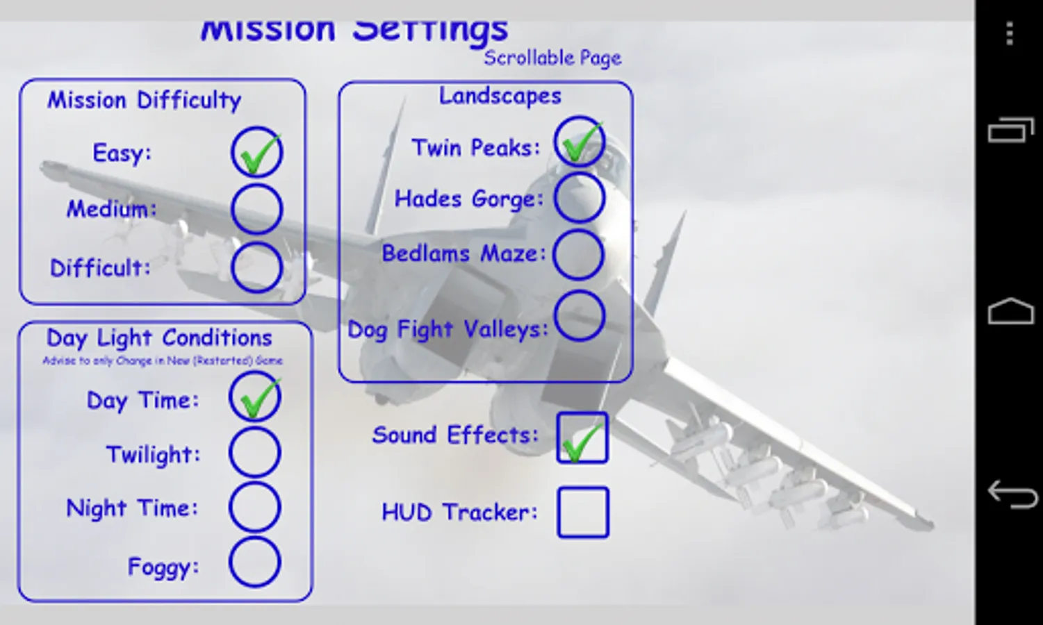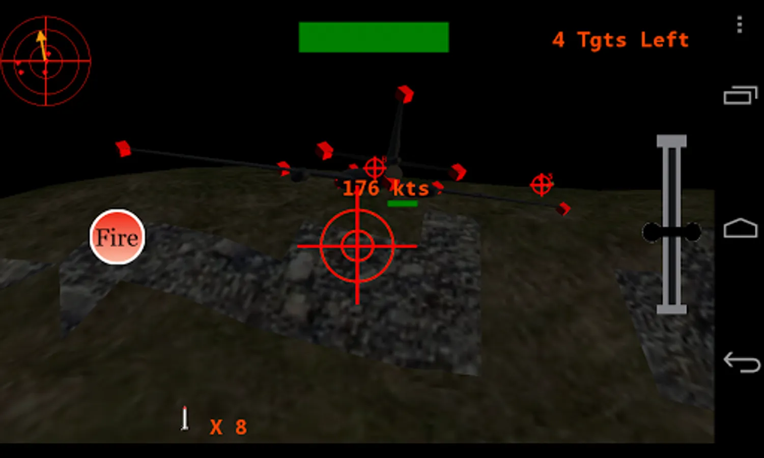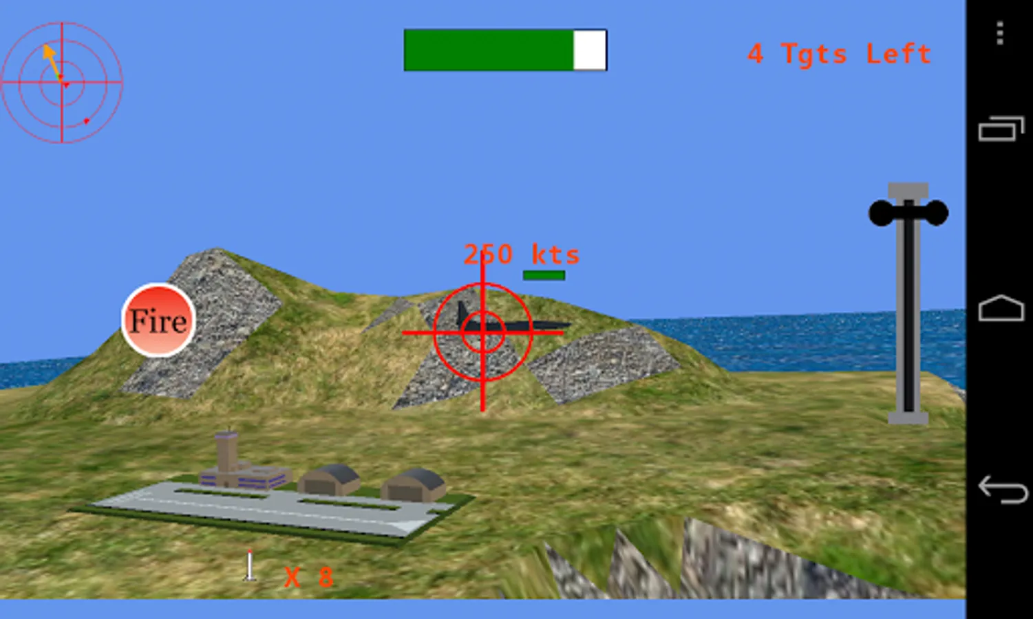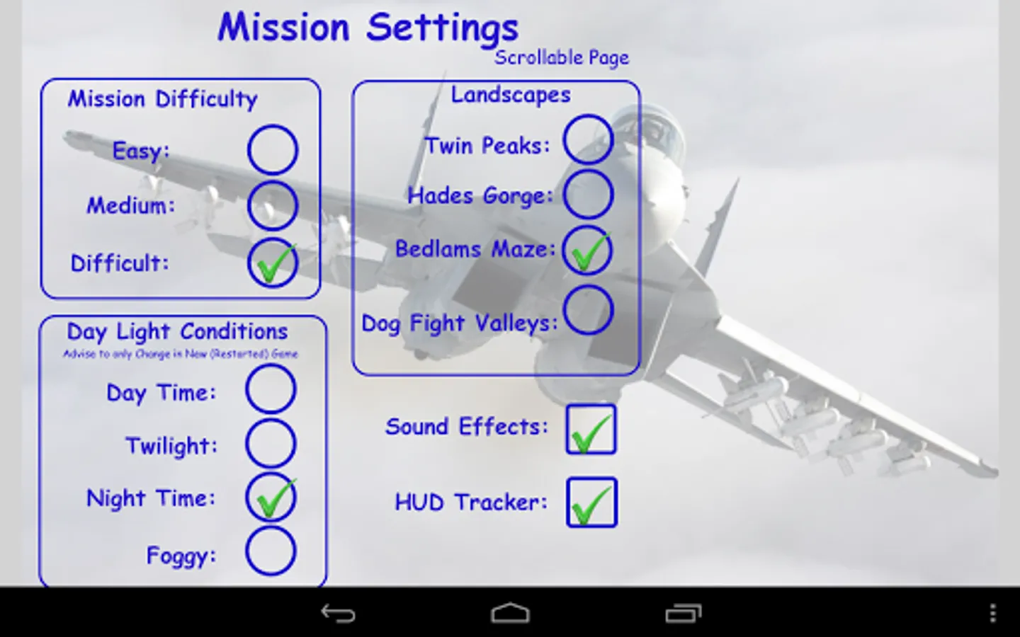 Outmanoeuvre other Fighter Aircraft and Land safely to replenish Rockets to complete your Mission. Radar and HUD Tracker Options available to make your Mission easier. And a High Games Scores count.