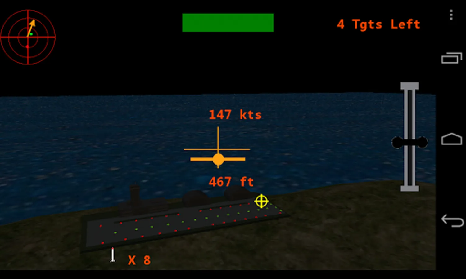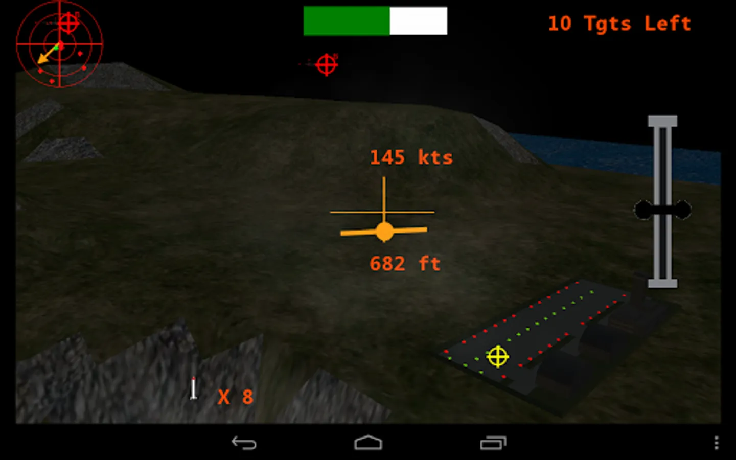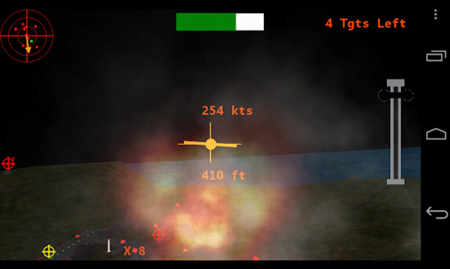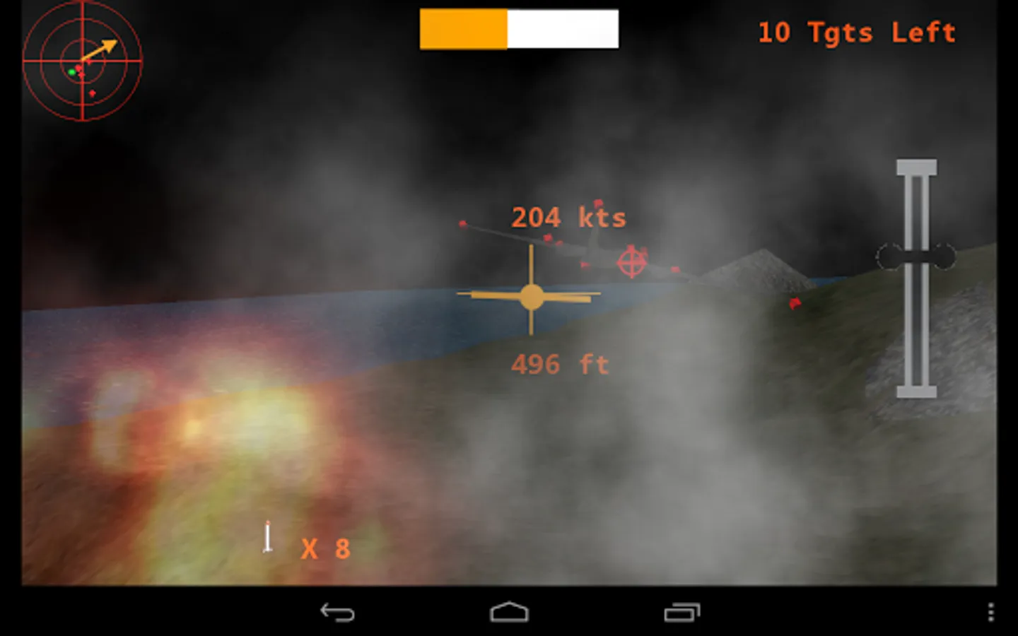 Engage in Air Combat amongst whilst flying through Hills and Valleys in full 3D space. Attack other Aircraft and Enemy Installations in Daylight, Twilight, Darkness and in Foggy Conditions.
