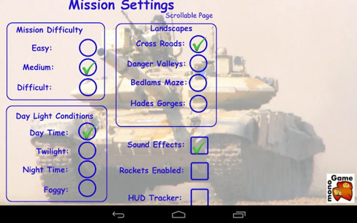 Take Command of Tank Battles across different 3D Terrains with other Tanks, Humvees and Orcas. Seek out and destroy Enemy units and Gun Sites, in Daylight, Night and Foggy conditions.