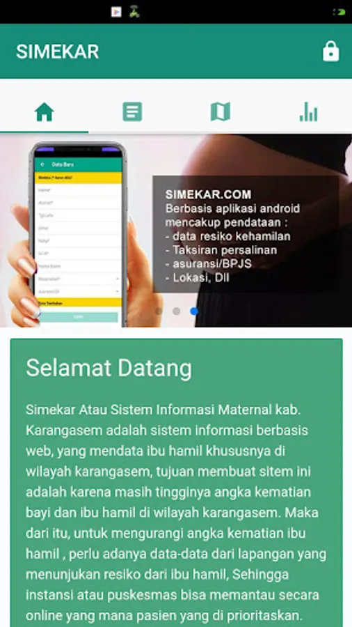 Simekar or Maternal Information System kab. Karangasem is an Apps-based information system, which records pregnant women especially in the Karangasem area, the purpose of making this system is because of the high infant and pregnant maternal mortality rates in the Karangasem region. Therefore, to reduce the mortality rate of pregnant women, it is necessary to have data from the field that shows the risks of pregnant women, so that agencies or health centers can monitor online which patients are prioritized