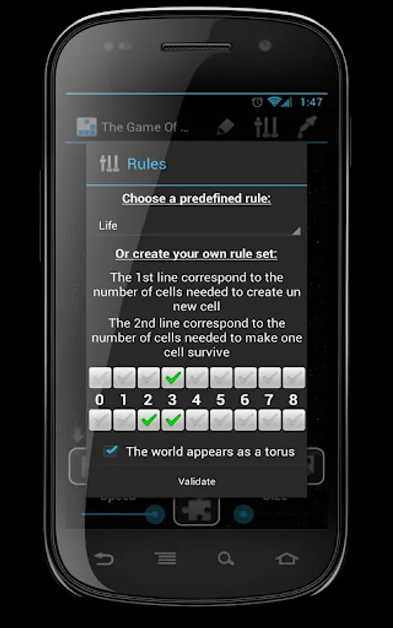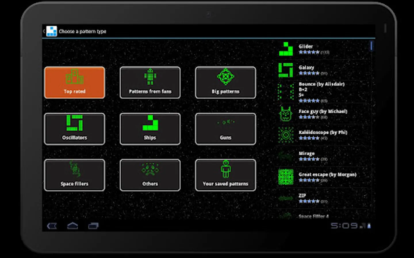 This game does not need the player itself (kind of zero-player game), but we can make it more interactive by adding special atterns that will evolve inspecific ways, or by changing the rules of the world, for instance.