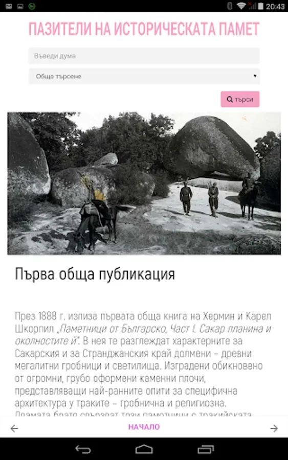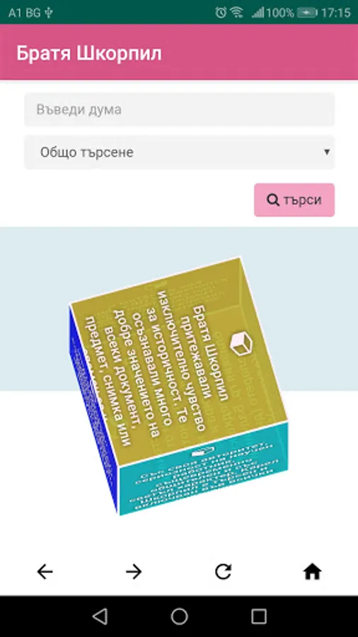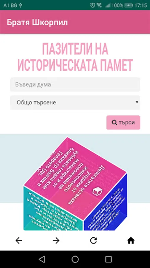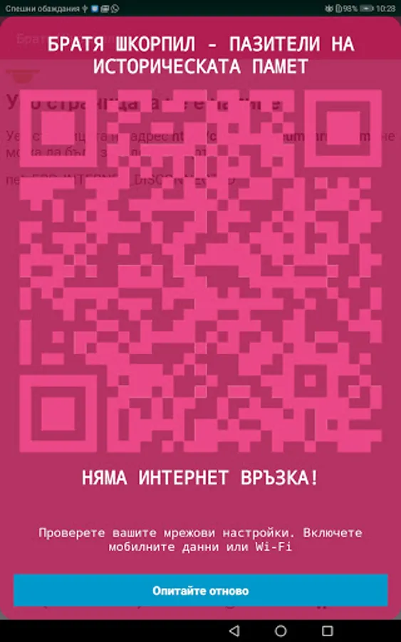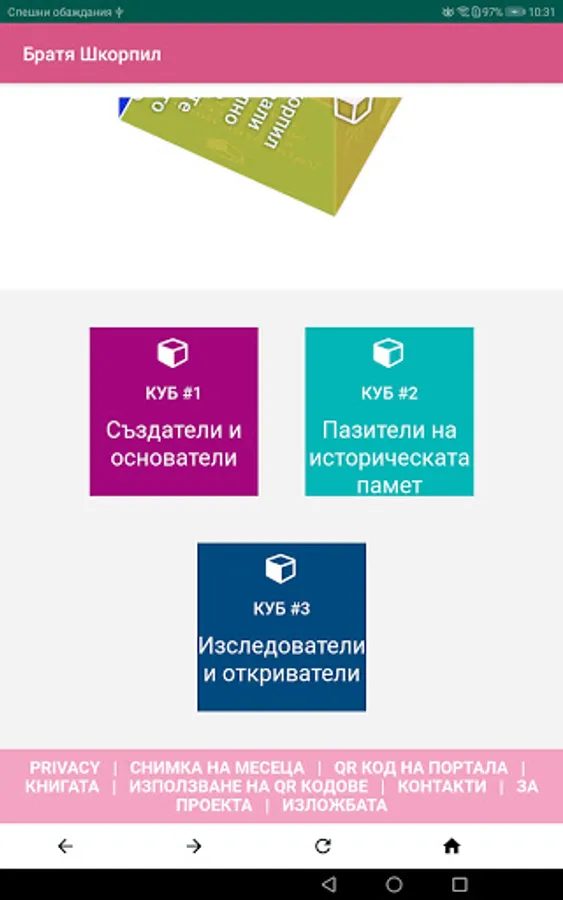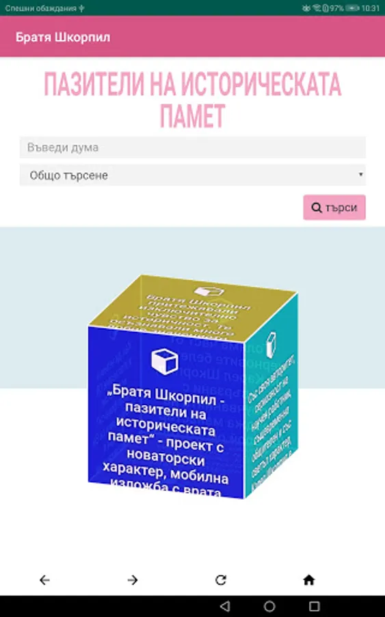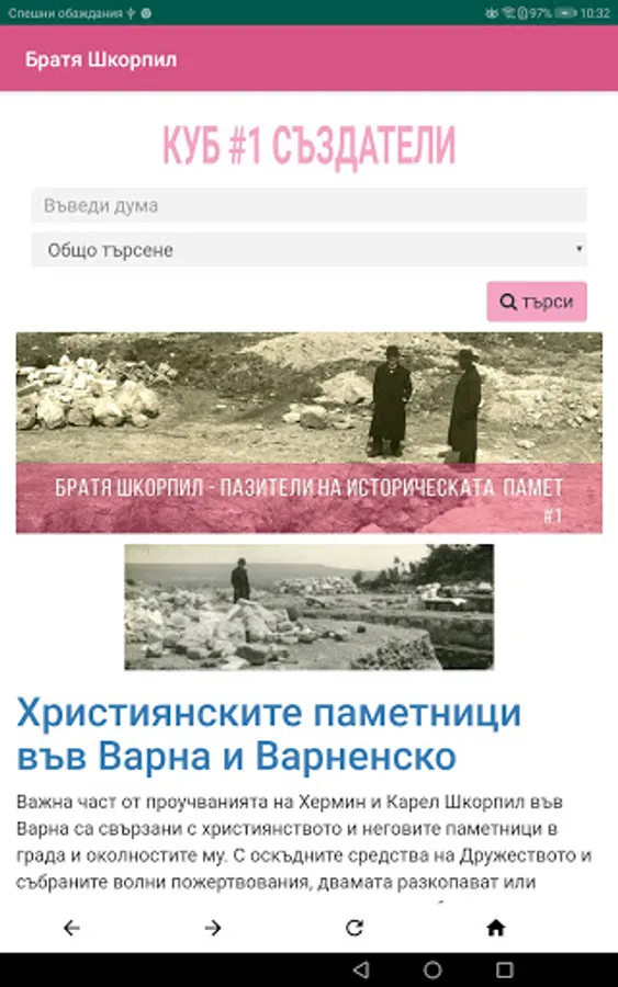 "SHKORPIL BROTHERS - GUARDIANS OF HISTORICAL MEMORY" is an innovative art project, which aims to, through the use of augmented reality and mobile devices, dynamically, accessible and attractive to present and promote unknown and little known facts, documents and photographs related to brothers Karel and Hermin Shkorpil, with their life and scientific activity in Bulgaria.