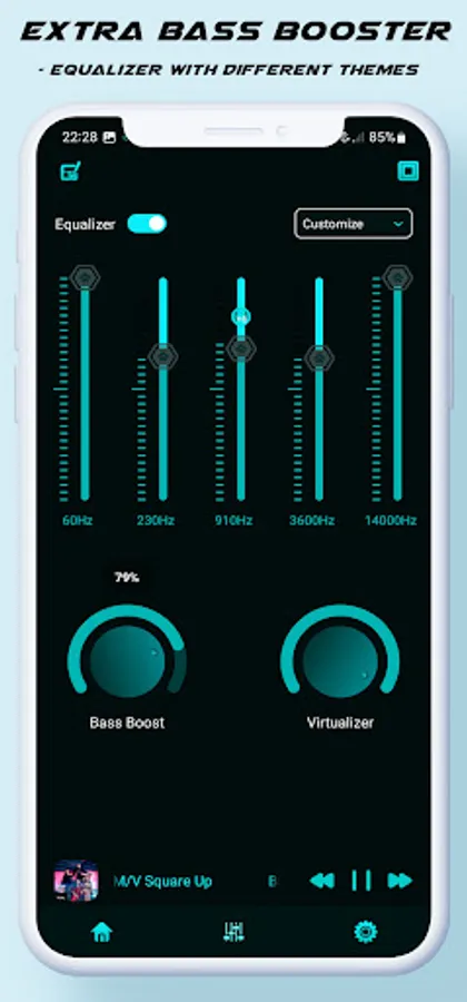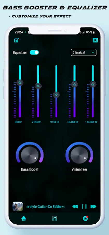What sets Bass Booster Plus from other similar applications is that when a user activates boost this app not only amplifies the sound to the end, but also uses the built-in Sound Android equalizer to optimize the Music frequency channels by means of a special algorithm. So the result is a stronger and clearer sound and Audio and Enjoy the music loud wtih Bass Booster Plus App.