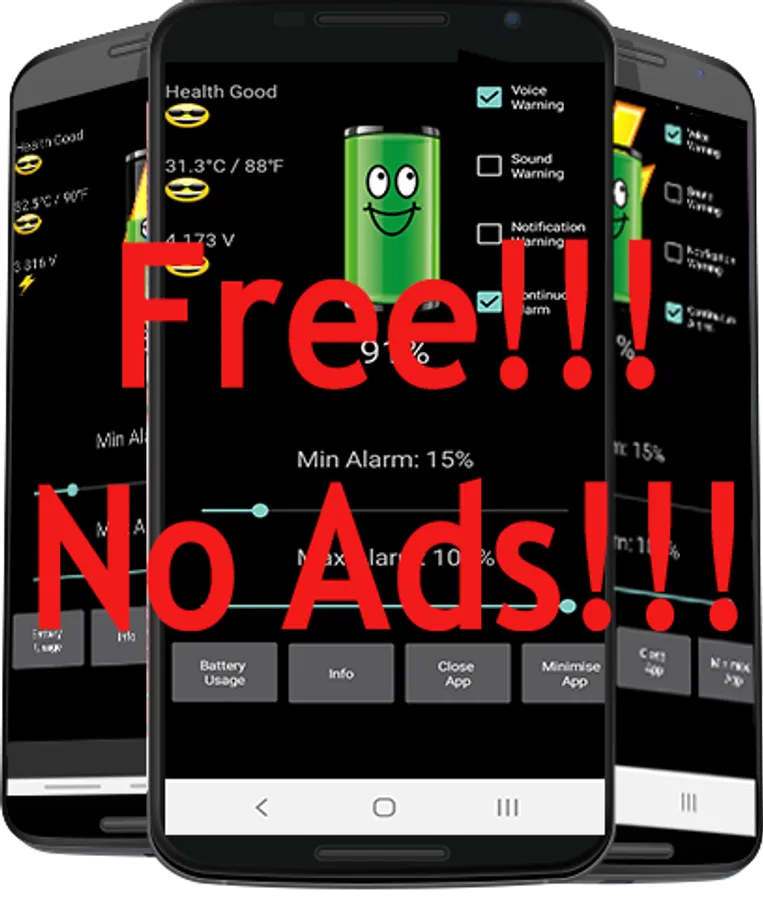 The Battery Alarm app has no ads, it doesn't steal data from your phone, it doesn't use the internet, it doesn't use critical licenses for Android, GPS, GSM...