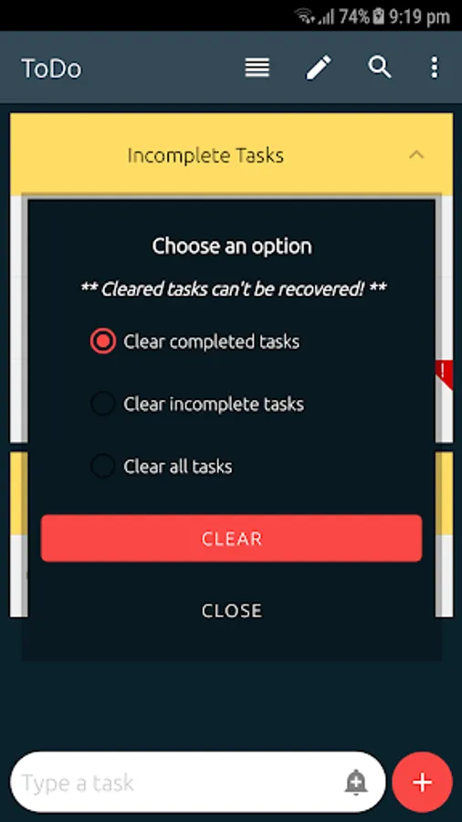 ⭐ Bulk clear your completed, incomplete or all tasks.