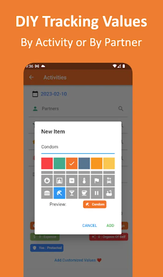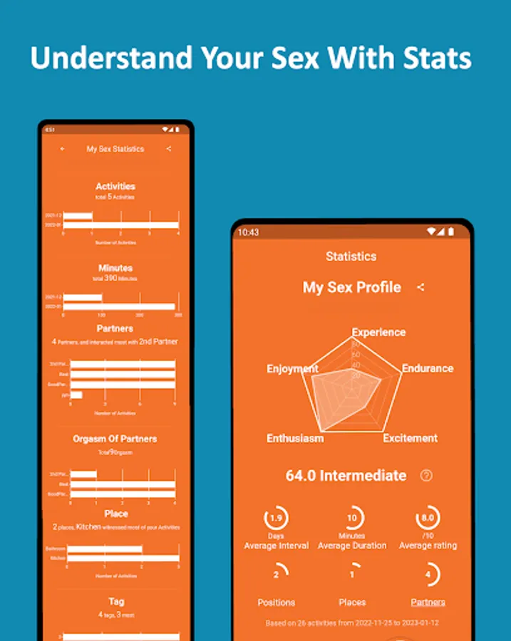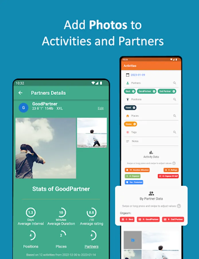*Powerful*: Record your sexual activities with partner(s), position(s), place(s), and tag(s). You can even track by partner values such as orgasm count of each partner.