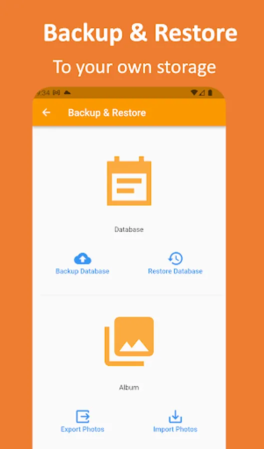 *Backup & Restore*: Backup data or export photos to recovery/import later.