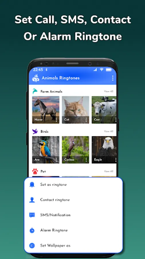 You can listen to any animal sound: animal noises easily by clicking a play button on it and set it as your ringtone for incoming calls and notifications.