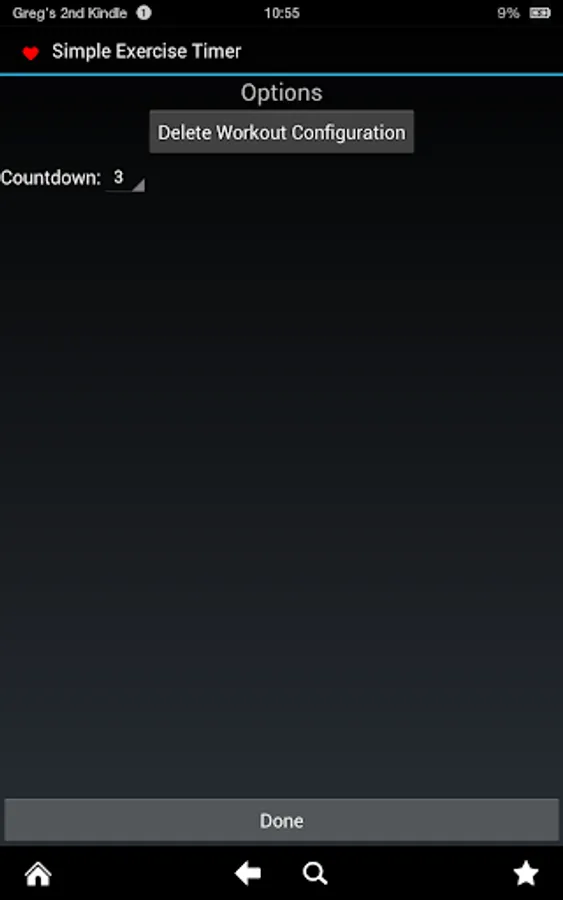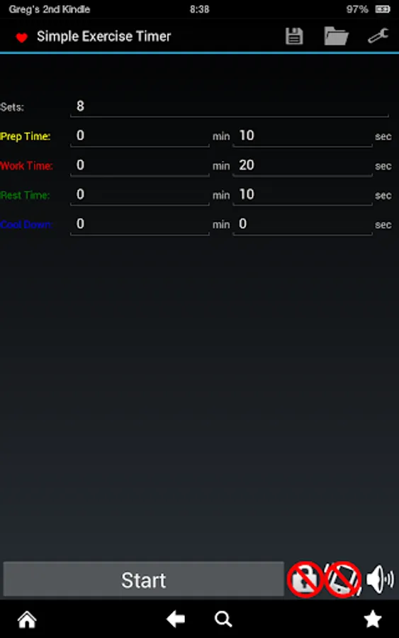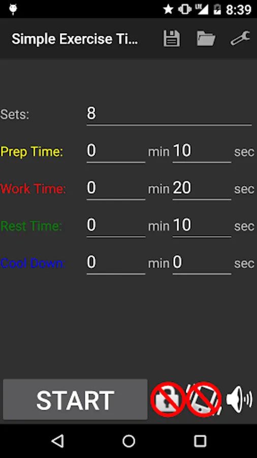 Save and load any number of workout configurations. The app comes with the standard Tabata configuration preloaded (8 sets of alternating 20 seconds of work and 10 seconds of rest). It also comes with a configuration for stretching.