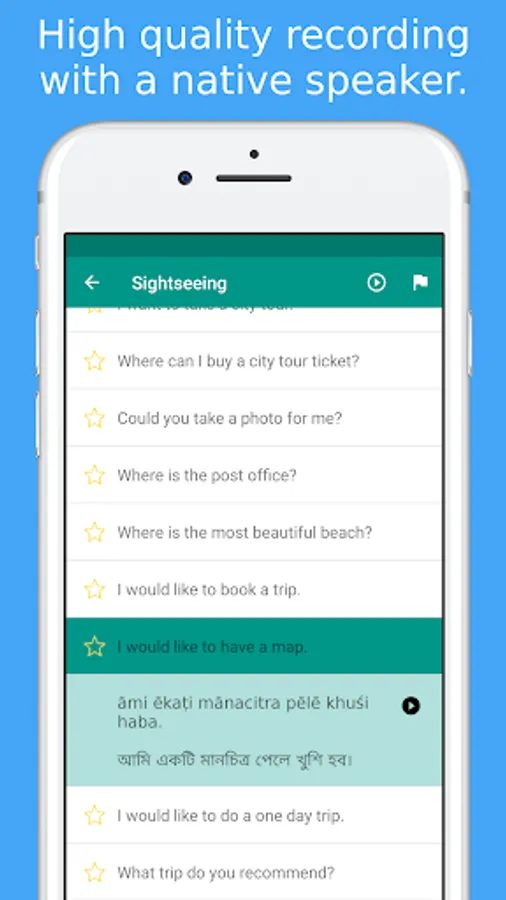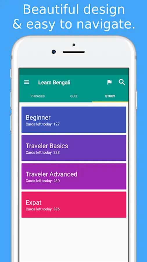 ★★★ Learn Bengali language when visiting Bangladesh ★★★Simply Learn Bengali Language App is a FREE language app that will assist you to speak Bengali quickly and effectively.All Bengali phrases and words are presented to you in both phonetic and original Bengali writing. They are recorded by a native speaker from Bangladesh.Save your favorite phrases and words to review them without fuss.Study your vocabulary with flashcards using the spaced repetition technique.Test your knowledge with fun Bengali language quiz and review your score.★★★ Survive when travelling in Bangladesh ★★★ Use the Bengali phrasebook to survive in Bangladesh. All important survival phrases are included.For example, let the app speak to the Taxi driver in Bangladesh to show them where you want to go.Search all phrases and words to quickly access what you need.★★★ Main Features ★★★✓ 300+ free Bengali phrases and words