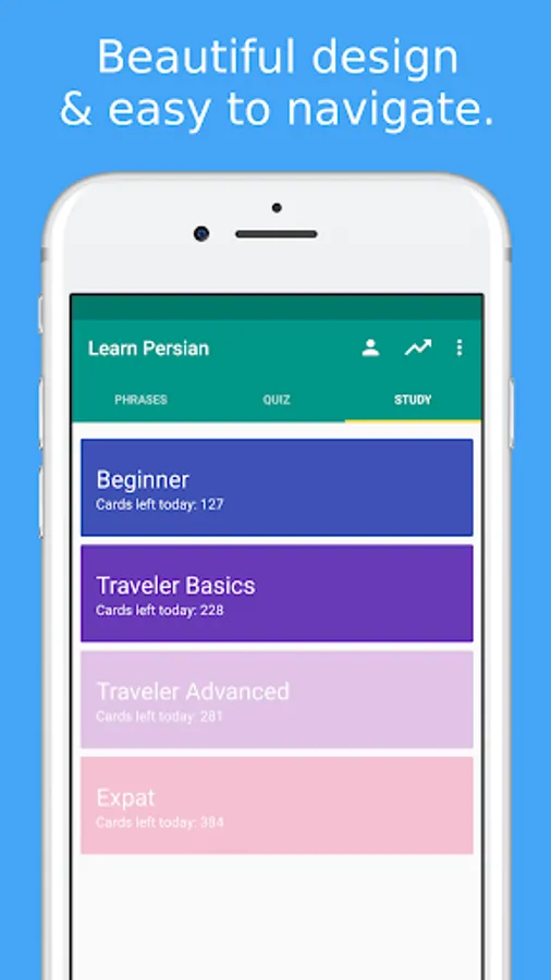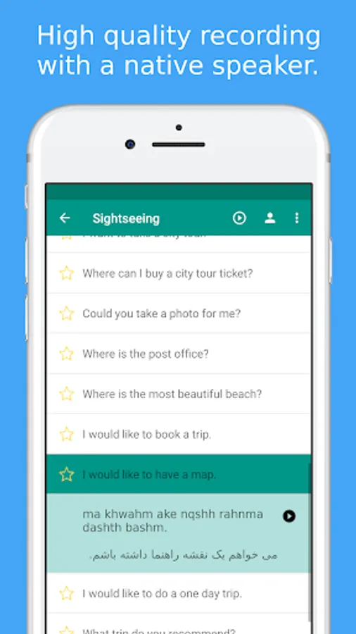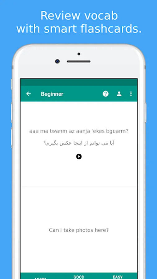 ★★★ How to say Thank you in Persian? Learn 1000+ useful words and phrases in Persian with Simply Learn Persian when visiting Iran ★★★ Simply Learn Persian Language App is a FREE language app that will assist you to speak Persian quickly and effectively.All Persian phrases and words are presented to you in both phonetic and original Persian writing. They are recorded by a native speaker from Iran.Save your favorite phrases and words to review them without fuss.Study your vocabulary with flashcards using the spaced repetition technique.Test your knowledge with fun Persian language quiz and review your score.★★★ Survive when travelling in Iran ★★★ Use the Persian phrasebook to survive in Iran. All important survival phrases are included.For example, let the app speak to the Taxi driver in Iran to show them where you want to go.Search all phrases and words to quickly access what you need.★★★ Main Features ★★★✓ 300+ free Persian phrases and words