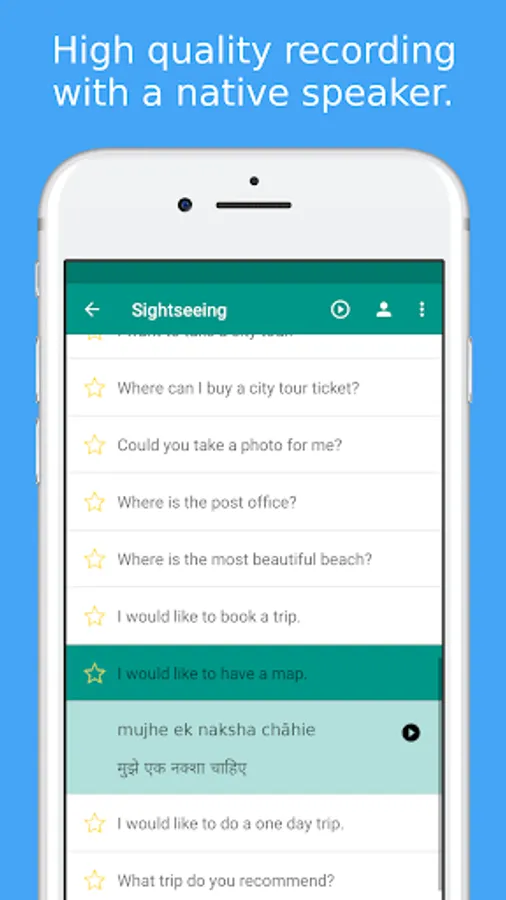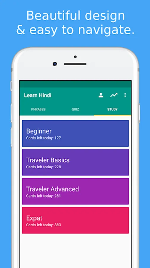 ★★★ Learn Hindi language when visiting India ★★★Simply Learn Hindi Language App is a FREE language app that will assist you to speak Hindi quickly and effectively.All Hindi phrases and words are presented to you in both phonetic and original Hindi writing. They are recorded by a native speaker from India.Save your favorite phrases and words to review them without fuss.Study your vocabulary with flashcards using the spaced repetition technique.Test your knowledge with fun Hindi language quiz and review your score.★★★ Survive when travelling in India ★★★ Use the Hindi phrasebook to survive in India. All important survival phrases are included.For example, let the app speak to the Taxi driver in India to show them where you want to go.Search all phrases and words to quickly access what you need.★★★ Main Features ★★★✓ 300+ free Hindi phrases and words