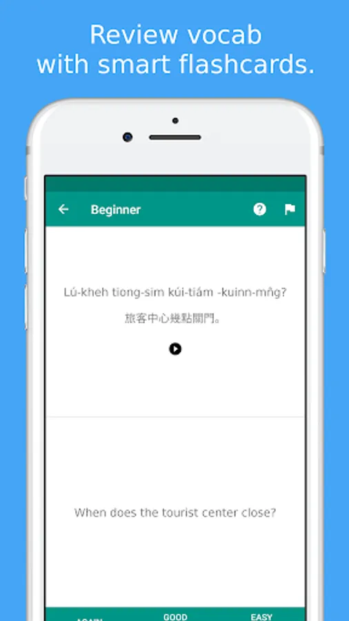★★★ Learn Hokkien language when visiting Taiwan ★★★Simply Learn Hokkien Language App is a FREE language app that will assist you to speak Hokkien quickly and effectively.All Hokkien phrases and words are presented to you in both phonetic and original Hokkien writing. They are recorded by a native speaker from Taiwan.Study your vocabulary with flashcards using the spaced repetition technique.Test your knowledge with fun Hokkien language quiz and review your score.★★★ Main Features ★★★✓ 300+ free Hokkien phrases and words