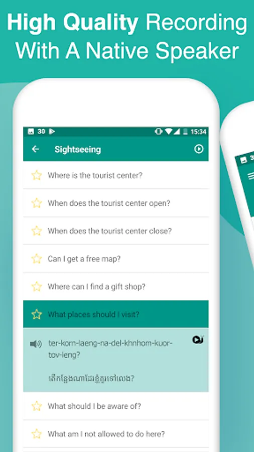 All Khmer (Cambodian) phrases and words are presented to you in both phonetic and original Khmer (Cambodian) writing. They are recorded by a native speaker from Cambodia.
