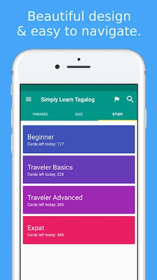 Simply Learn Tagalog Language App is a FREE π language app that will assist you to speak Tagalog quickly and effectively β‘.All Tagalog phrases and words are presented to you in both phonetic and original Tagalog writing. They are recorded by a native speaker from Philippines π§π».Save your favorite phrases and words to review them without fuss β€οΈ.Study your vocabulary with flashcards using the spaced repetition technique.Test your knowledge with fun Tagalog language quiz and review your score.β