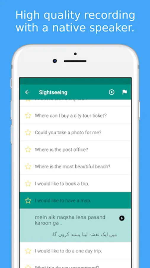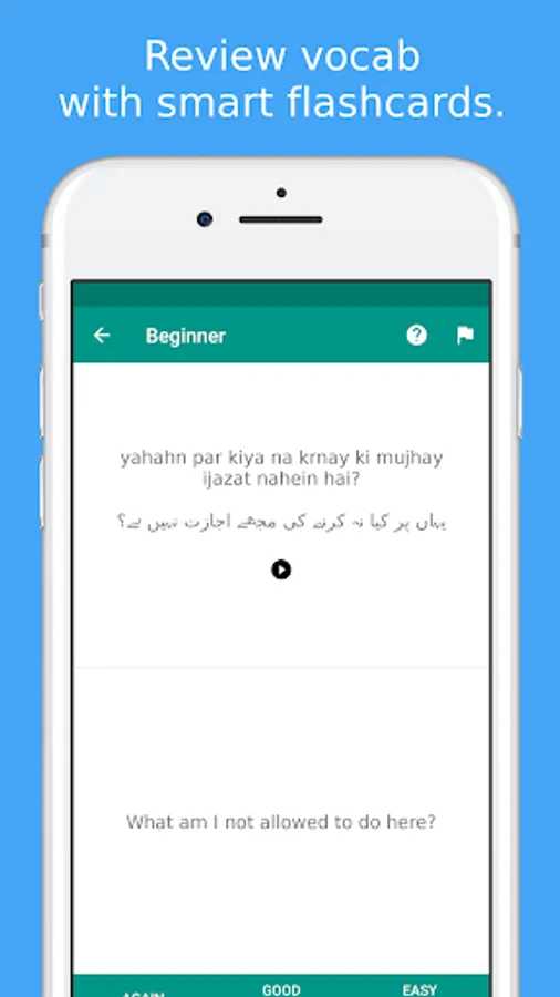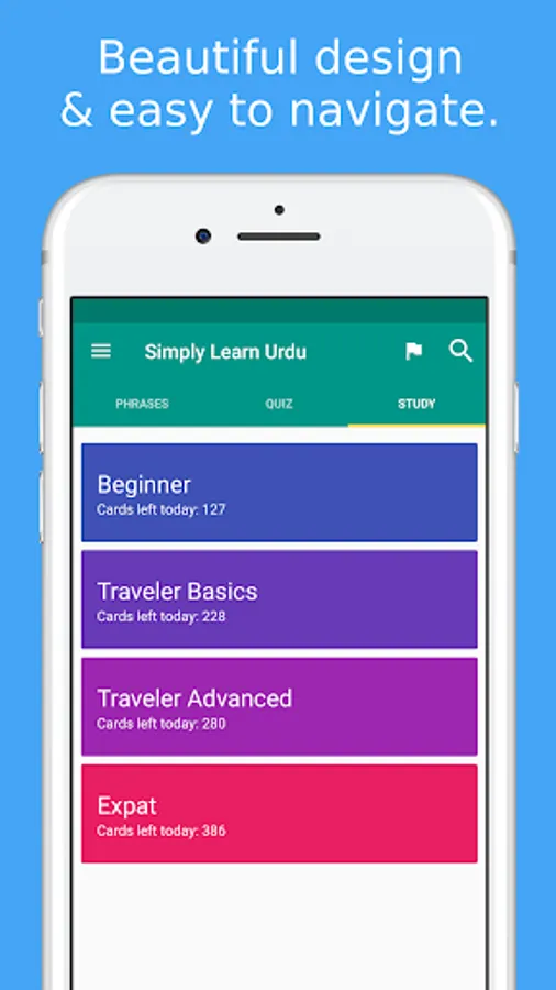 ★★★ Learn Urdu language when visiting Pakistan ★★★Simply Learn Urdu Language App is a FREE language app that will assist you to speak Urdu quickly and effectively.All Urdu phrases and words are presented to you in both phonetic and original Urdu writing. They are recorded by a native speaker from Pakistan.Save your favorite phrases and words to review them without fuss.Study your vocabulary with flashcards using the spaced repetition technique.Test your knowledge with fun Urdu language quiz and review your score.★★★ Survive when travelling in Pakistan ★★★ Use the Urdu phrasebook to survive in Pakistan. All important survival phrases are included.For example, let the app speak to the Taxi driver in Pakistan to show them where you want to go.Search all phrases and words to quickly access what you need.★★★ Main Features ★★★✓ 300+ free Urdu phrases and words