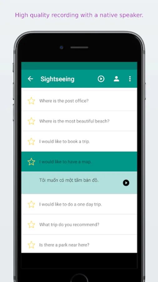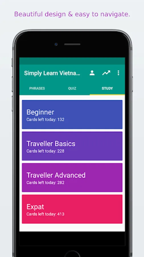 ★★★ Learn Vietnamese language when visiting Vietnam ★★★Simply Learn Vietnamese Language App is a FREE language app that will assist you to speak Vietnamese quickly and effectively.All Vietnamese phrases and words are presented to you in both phonetic and original Vietnamese writing. They are recorded by a native speaker from Vietnam.Save your favorite phrases and words to review them without fuss.Study your vocabulary with flashcards using the spaced repetition technique.Test your knowledge with fun Vietnamese language quiz and review your score.★★★ Survive when travelling in Vietnam ★★★ Use the Vietnamese phrasebook to survive in Vietnam. All important survival phrases are included.For example, let the app speak to the Taxi driver in Vietnam to show them where you want to go.Search all phrases and words to quickly access what you need.★★★ Main Features ★★★✓ 300+ free Vietnamese phrases and words