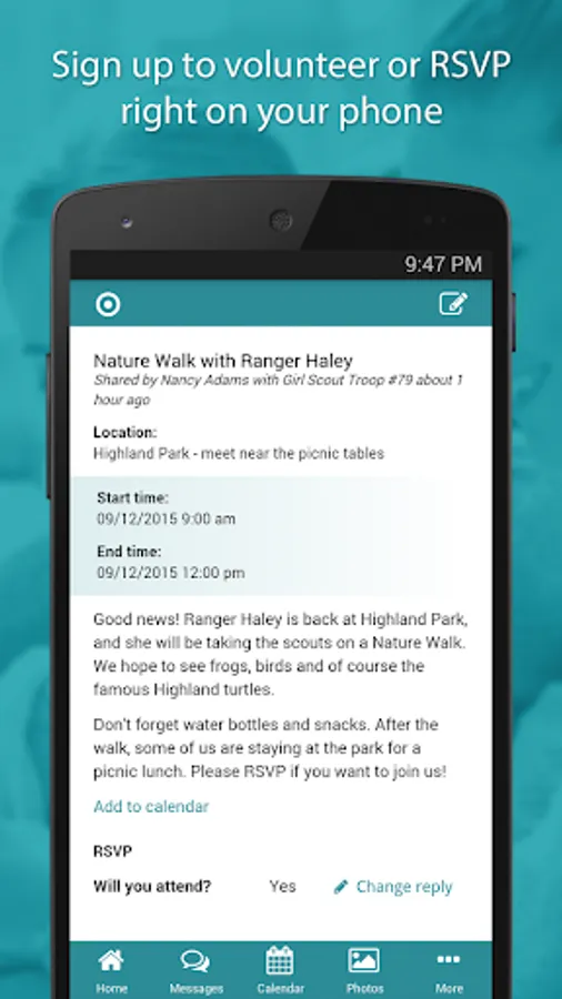 INTEGRATED VOLUNTEER SIGNUPS. Simple volunteer features are included right in the SimplyCircle platform, so you don’t have to manage your group communications across multiple different services. Group members can sign up to volunteer with one click of a button, right from their phone.