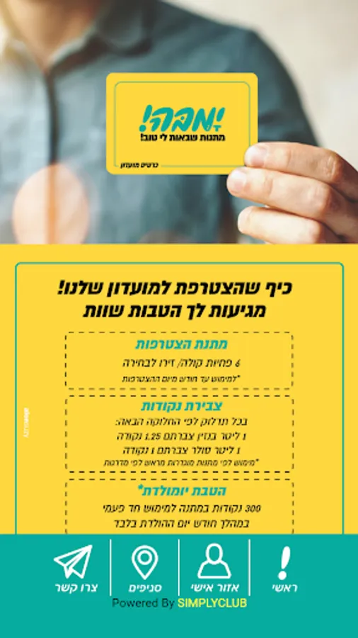 Yamba Club was established in the belief that the online retail market is gaining momentum, and the retail future is online, the club aims to be a retail store, which will contain many and varied categories of products and services, with the customer finding what he wants, Cooperations with bodies that will complete the needs of the club member, including significant discounts based on the accumulation of points, the conditions and benefits that the club member will receive in these bodies will be preferred and attractive.