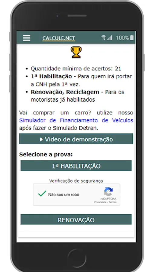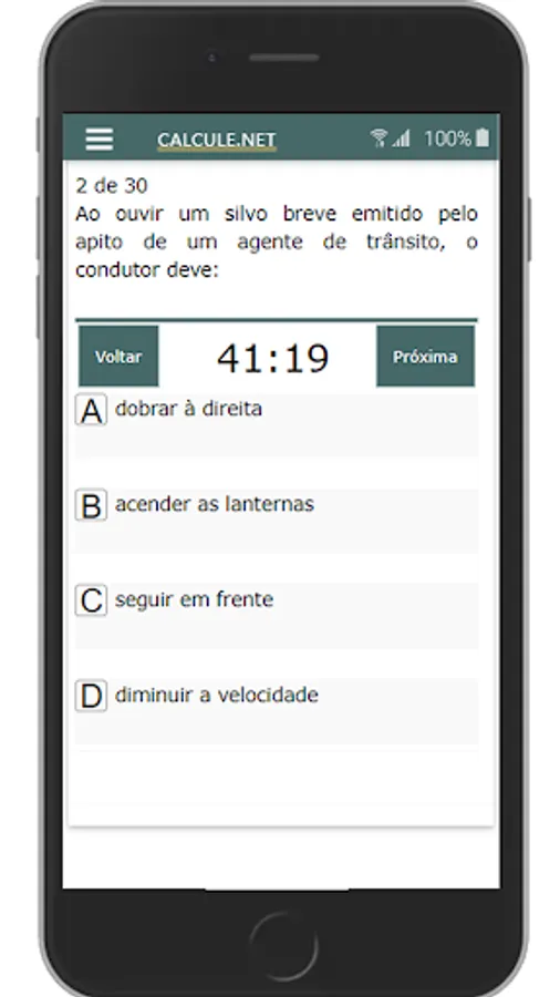 Questions are randomly drawn from a database and made available for you to answer in a given time. The test is applied to students who are in the process of obtaining their first driver's license or renewing their CNH (National Driver's License)