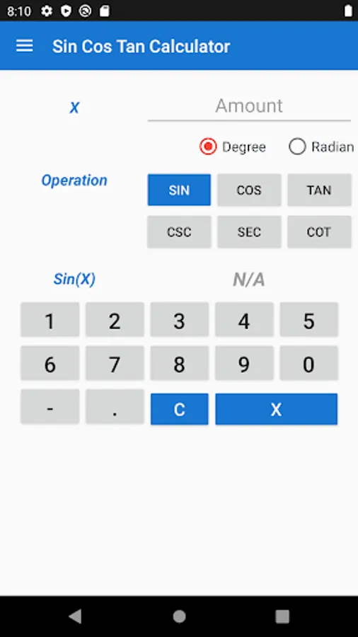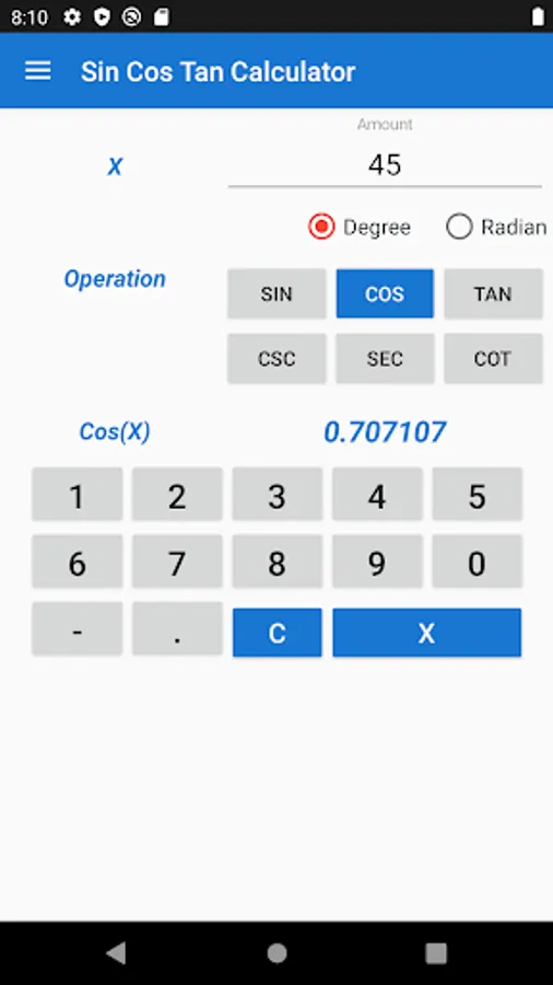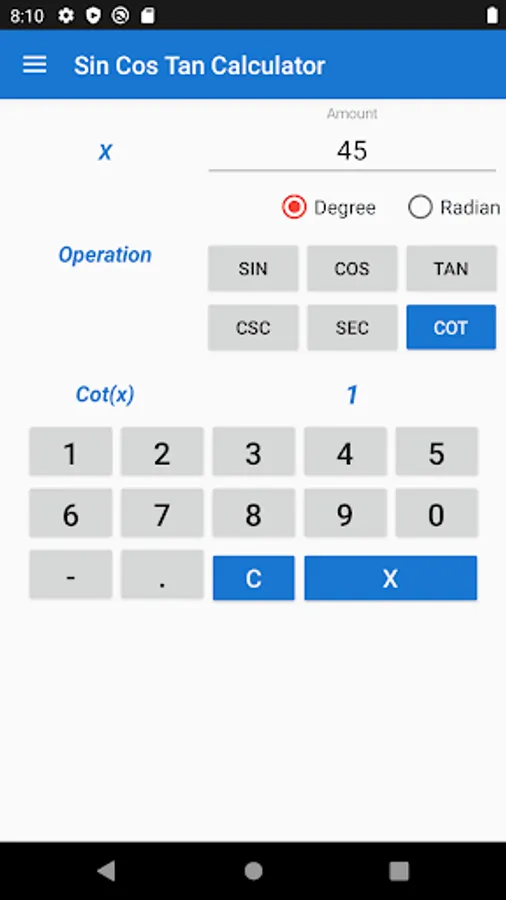 You just have to set the value in degrees or radians and select the function. The result will be displayed instantly.
